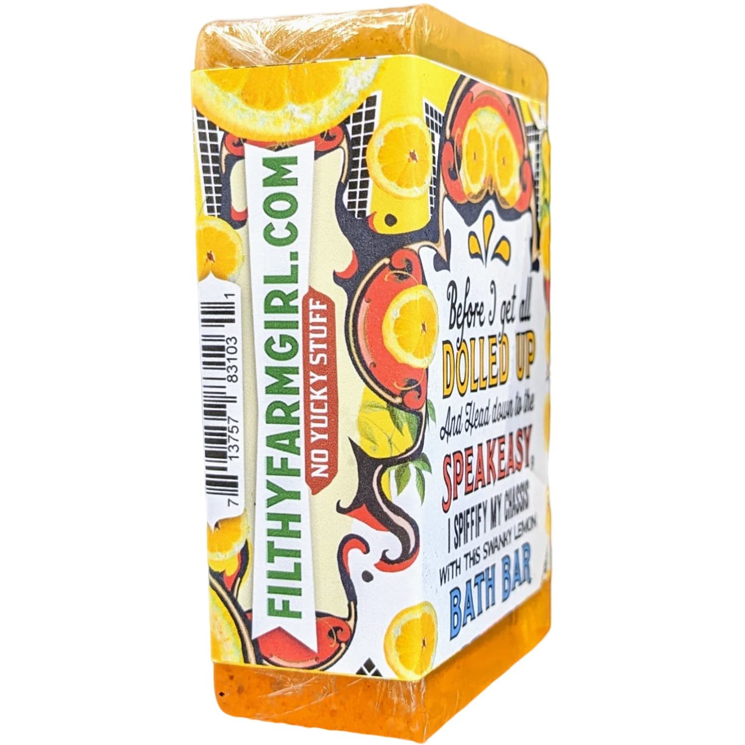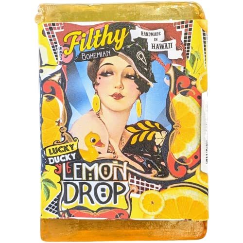 Product description: Filthy Farmgirl Filthy Bohemian Lucky Ducky Lemon Dropall natural large lemon jojoba soap bar by Filthy Farmgirl. Each handmade soap bar is cut to over 5 ounces. Each bar soap measures approximately 3.5 x 2.5 x 1 inch. Special ingredients include Jojoba, Castor Safflower oils, Lemon Essential Oil, Lemongrass Essential Oil, Lemon Peel, Kosher Vegetable Glycerin. Filthy Farmgirl vegan friendly glycerin soap bars are 100% natural and suitable for the entire body. Being good to the earth starts with being good to each other! Healthy, happy (and yes, clean!) people are intrinsically good for the planet. Our natural soaps put people in touch with the real world through their senses, and enlivens the otherwise mundane ritual of bathing. We have been cooking soaps for ourselves for many years, and now we are happily putting quality bath products into the hands of like minded farmgirls and farmboys like you. Our soap recipes are all 100% natural. Coconut Oil is the main ingredient, Saponified Vegetable Oils (Coconut, Palm, Castor and Safflower), Kosher Veggie Glycerin, highest quality essential oils herbs and spices (Organic when available), Sorbitol (natural thickener), Purified Water Sorbitan oleate (natural emulsifier), Sodium hydroxide (natural saponifier). Absolutely no detergents, surfactants, sulfates, artificial scents, colorizers, or petroleum products of any kind. Our Labels are printed on 100% recycled paper. We work hard to make sure every single bar of our soap is made with love and care, and our company is eco-friendly. Soap is not just about getting clean, it?s about loving your body and the earth. All natural large glycerin bar soap with essential oils by Filthy Farmgirl.