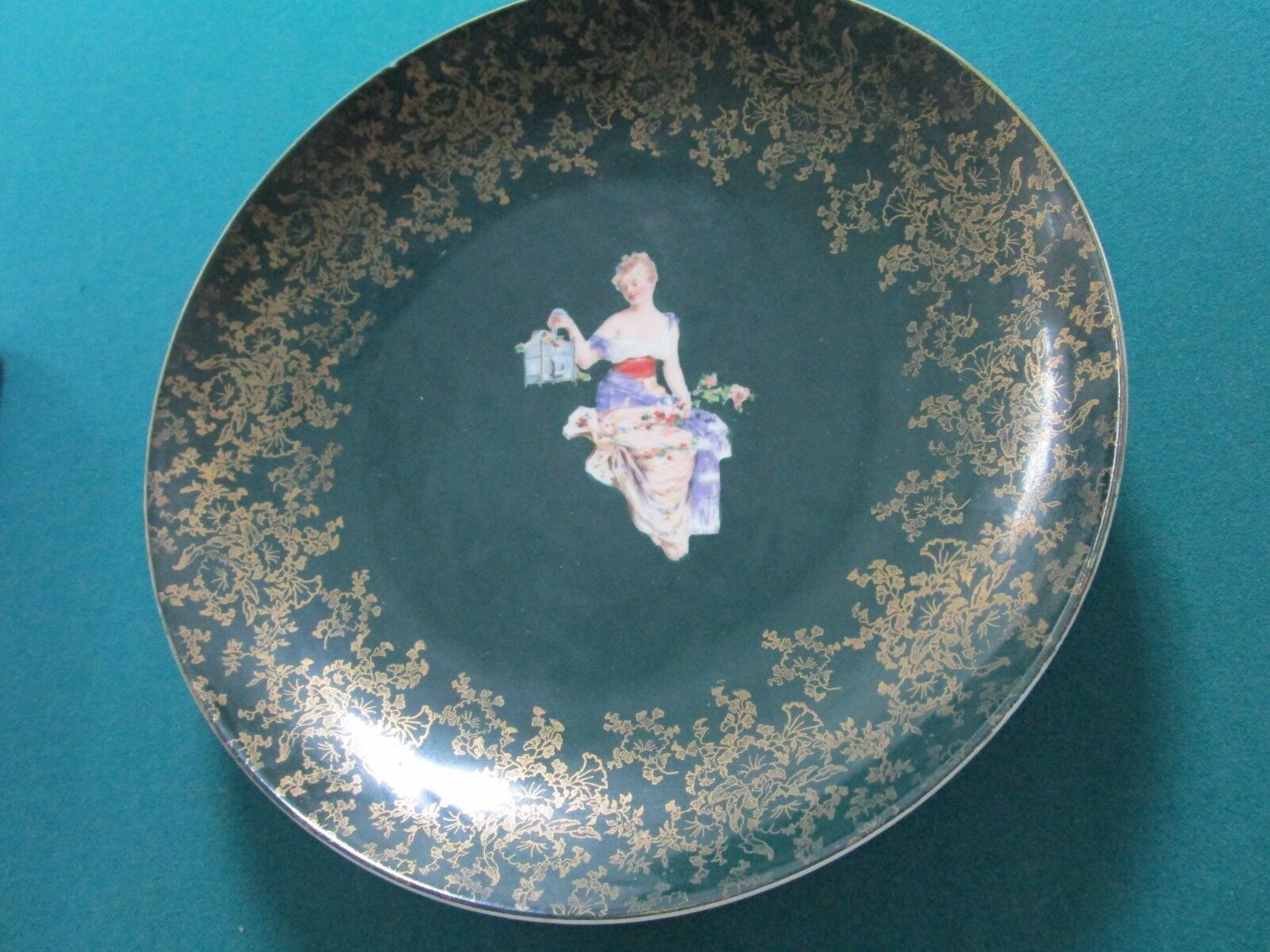 ROYAL VIENNA BOHEMIAN 1900s WALL PLATE W/ HANGER AUSTRIA LADY WITH BIRDCAGE