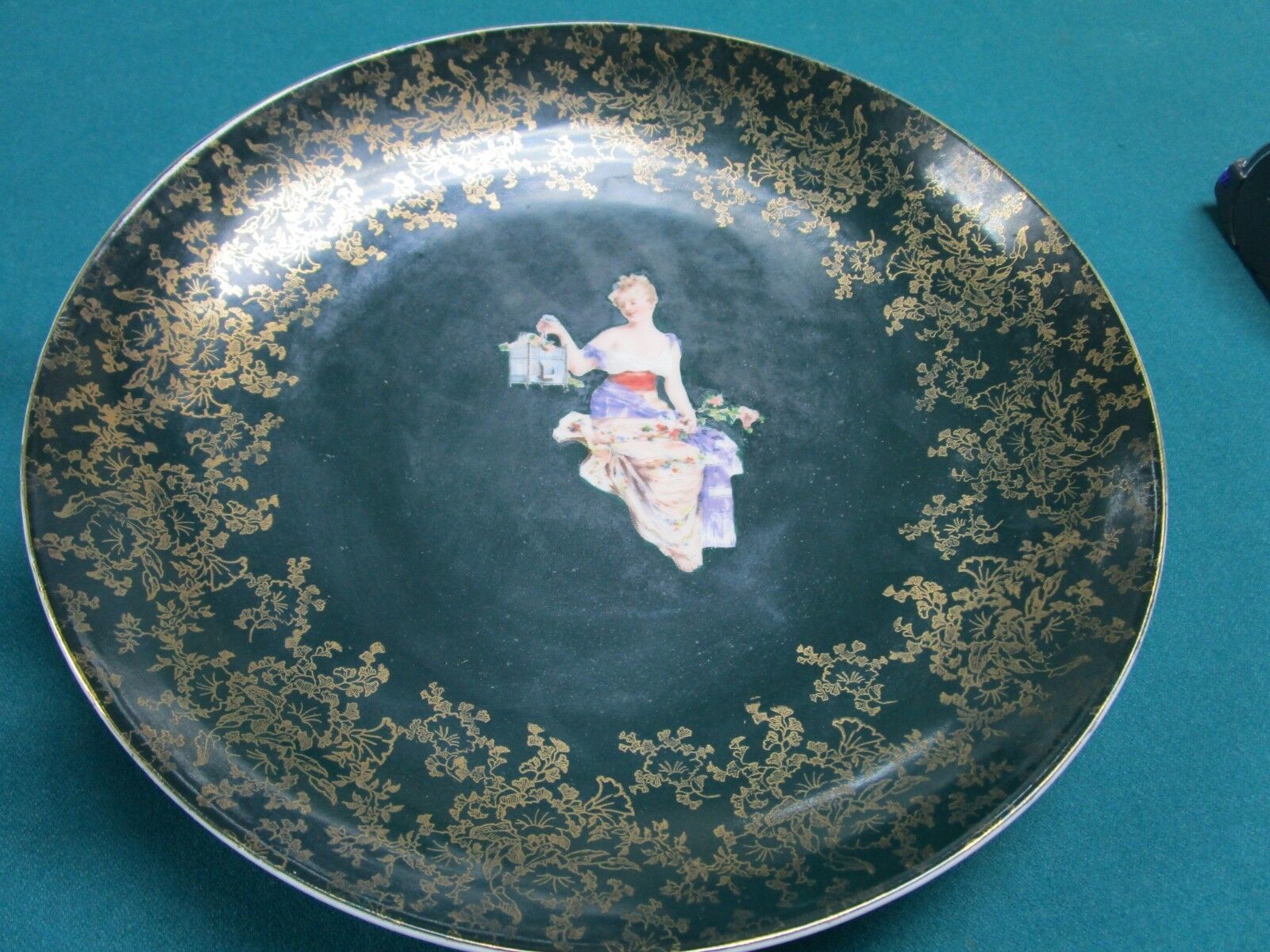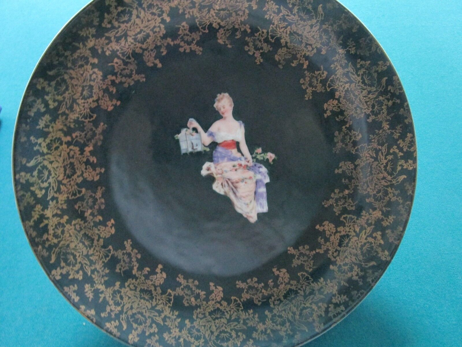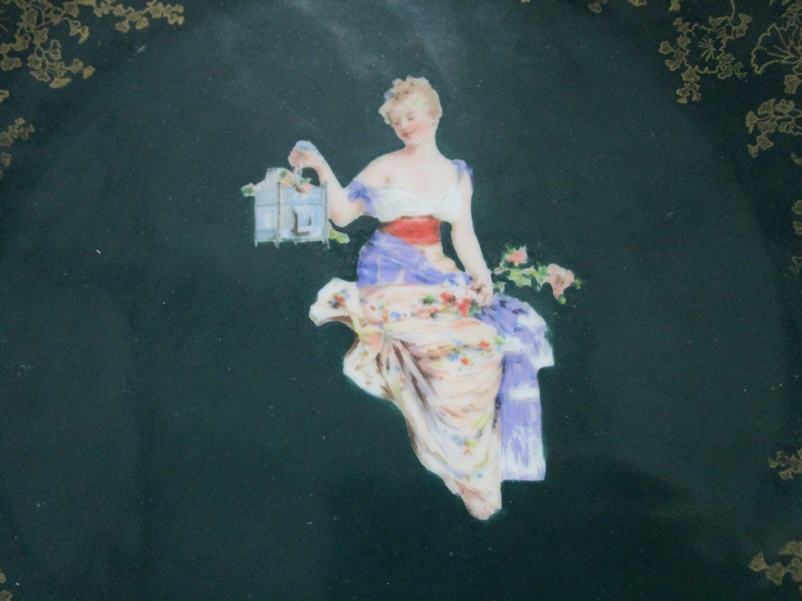 ROYAL VIENNA BOHEMIAN 1900s WALL PLATE W/ HANGER TRANSFER LADY WITH BIRDCAGE 2 X 13 1/2" VERY GOOD CONDITION, SOME LIGHT SURFACE SCRATCHES COMMENSURATE WITH AGE [*MULBERRY]