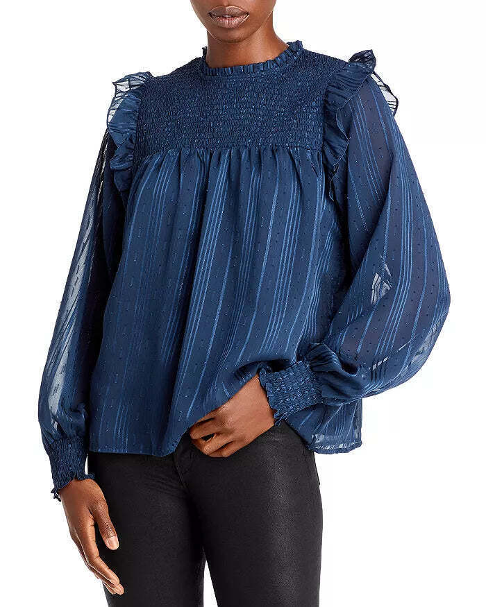Item Notes:Fits true to size, order your normal size Model measurements: 510 height, 33.5 bust, 23.5 waist, 34.5 hips, wearing a size small PRODUCT DETAILS Ruffled mockneck Smocked front and back yoke Ruffled shoulders Long sleeves, smocked cuffs Back zip closure Striped jacquard fabric This item is part of our 100% Bloomingdales collection, featuring exclusive pieces you wont find anywhere else. Imported MATERIAL CARE 99% polyester/1% metallic; lining : 100% polyester Hand wash Box H64 (M/Blue-1)Box H64 (M/Blue-2)Listed: Martha Russel Due to variances in monitor color, and lighting, the color of some items may differ slightly from the photographsAbout us:Vanessa Jane is a family-owned business based in Indiana. We sell only authentic merchandise from brand new to used, and list new inventory daily. Make sure to put us on your favorites to see what's new each day! We source all of our inventory from reputable sales channels, including: Macy's Amazon Walmart Home Depot Office Depot Lowes Build.com And many more Box H64 (XS/Blue)Box H64 (M/Blue)Listing SKU: VJ6937062441045