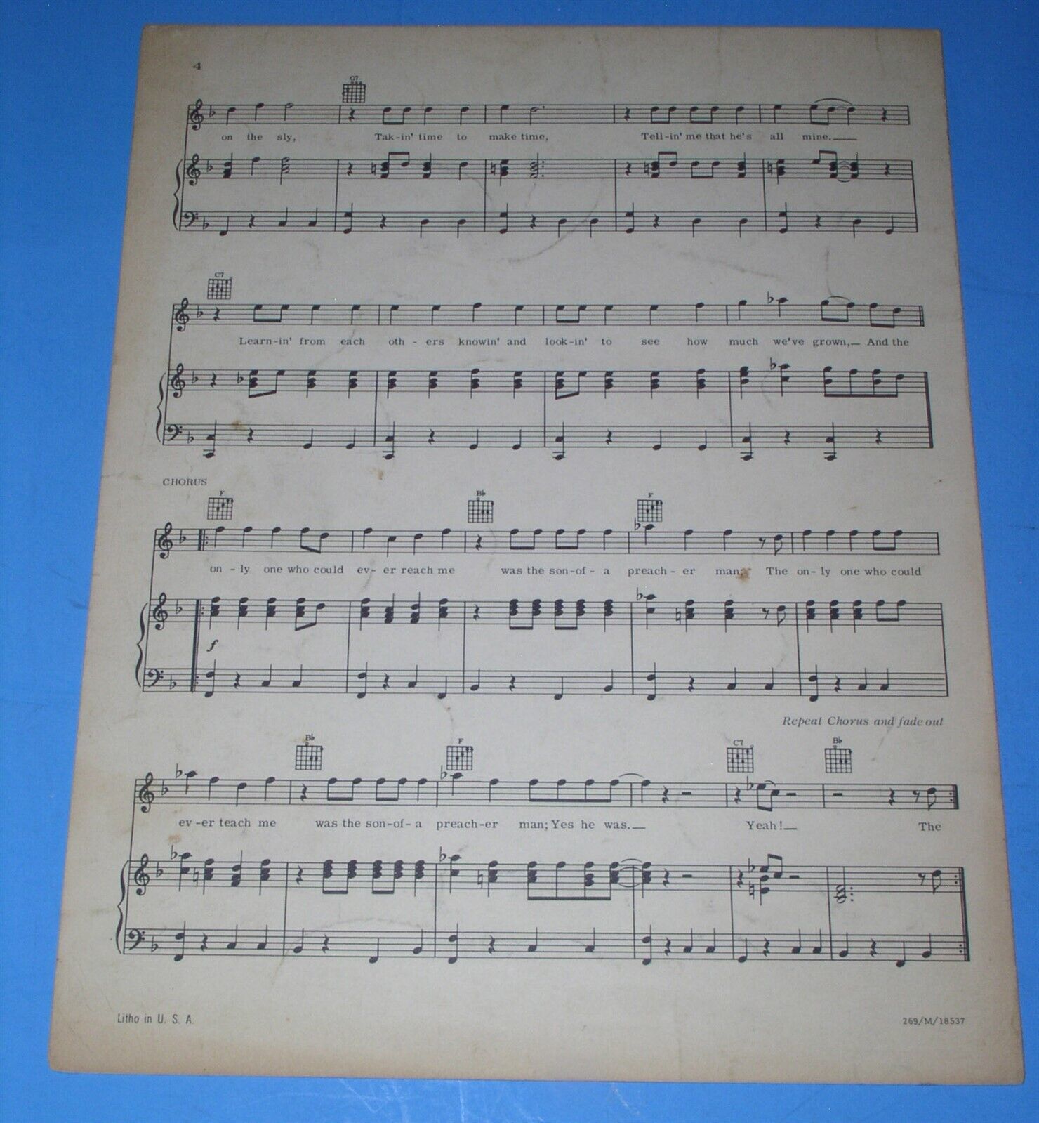 This is the original, vintage sheet music for the Dusty Springfield song, "Son Of A Preacher Man". Dated 1968 Tree Publishing. Printed on heavy card stock paper. A terrific item for the fan or collector.
