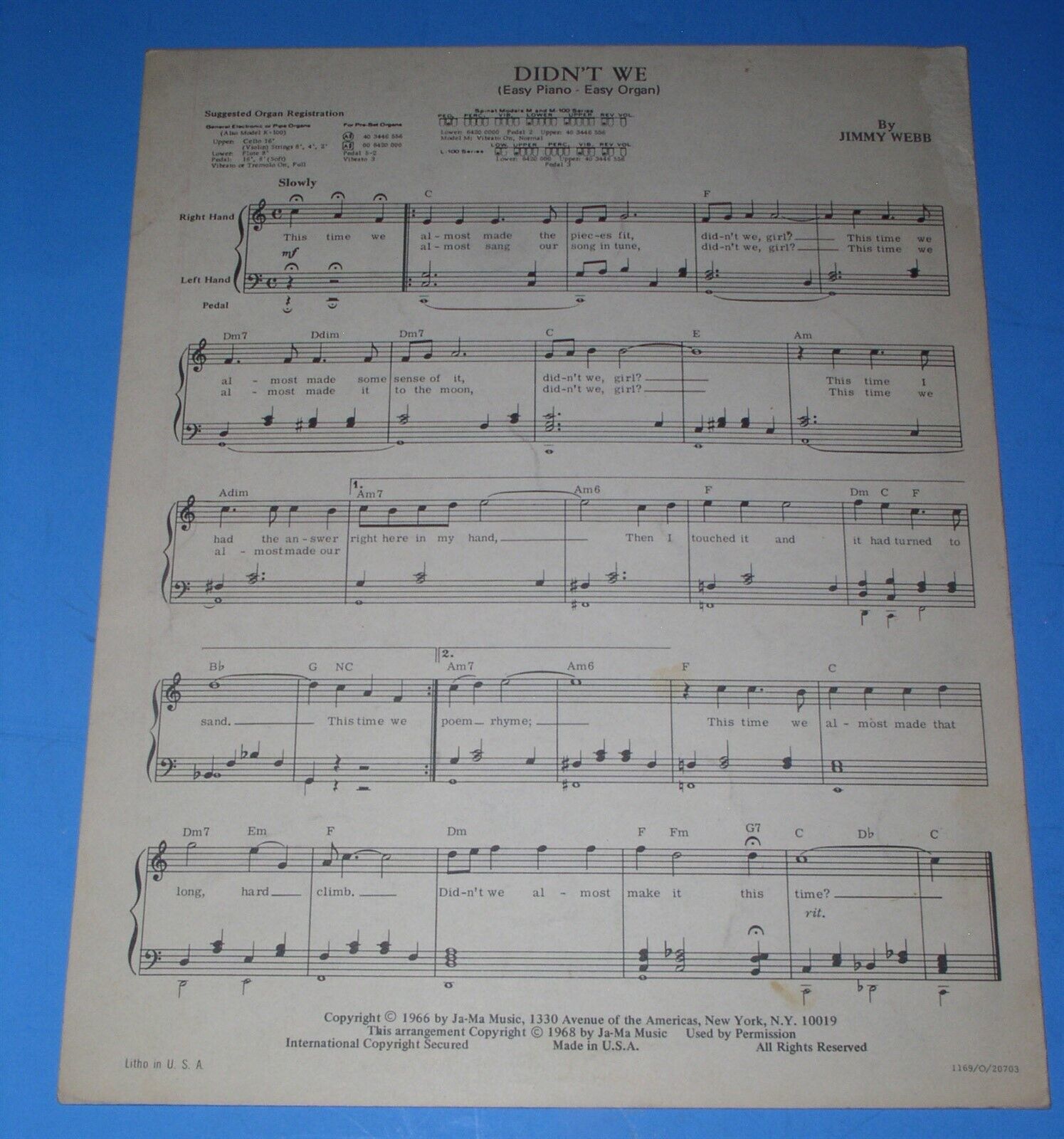 This is the original, vintage sheet music for the Richard Harris song, "Didn't We". Dated 1966 Ja-Ma Music. Printed on heavy card stock paper. A terrific item for the fan or collector.