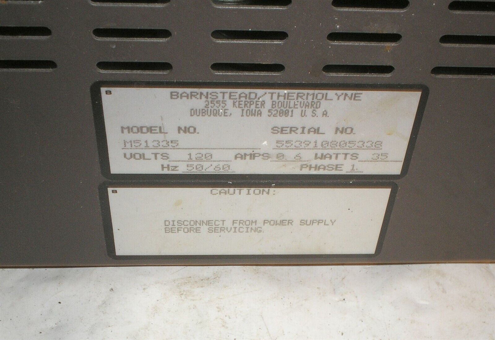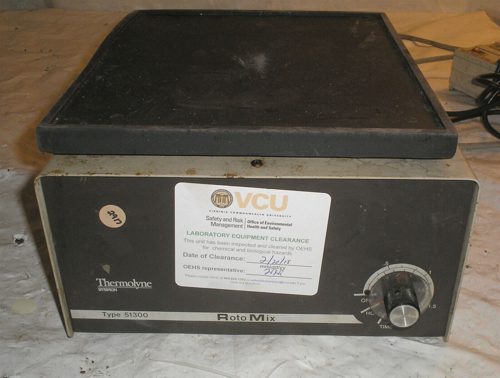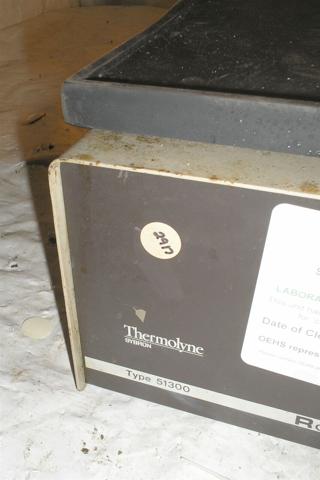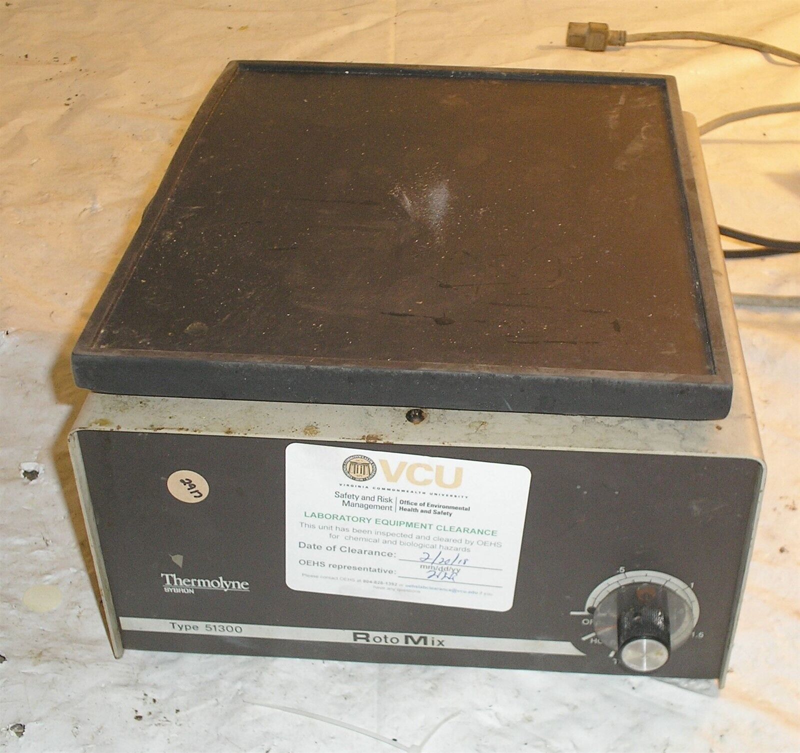 Barnstead Thermolyne RotoMix Type 51300 Model M51335. This item powers on and motor spins but the top does not seem to move. I am not sure if there is a missing belt or some other unhooked linkage. Will need repaired before final use. See photos for physical condition.