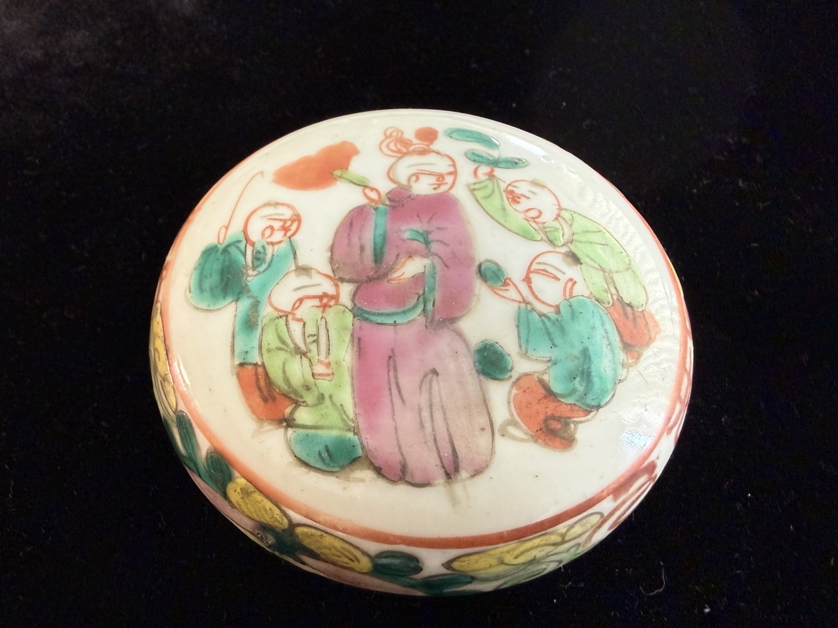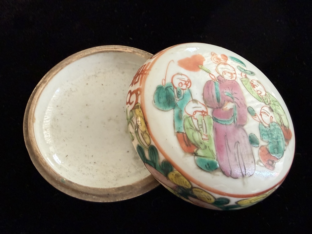 Antique Chinese Famille Verte Seal Paste or Ink box with childrens' playing and Double Happiness design, measured 2 1/8" tall, 3 1/2" diameter. Dated early 1900. From store we use to operate in SF Chinatown from the 50s to 80s. Excellent condition, no crack, chip or repair. California resident please add sales tax.