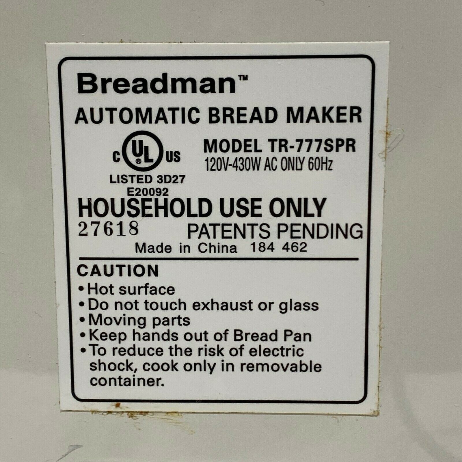 Breadman Bread Maker Breadman Models TR777, TR777C, TR777SPR |