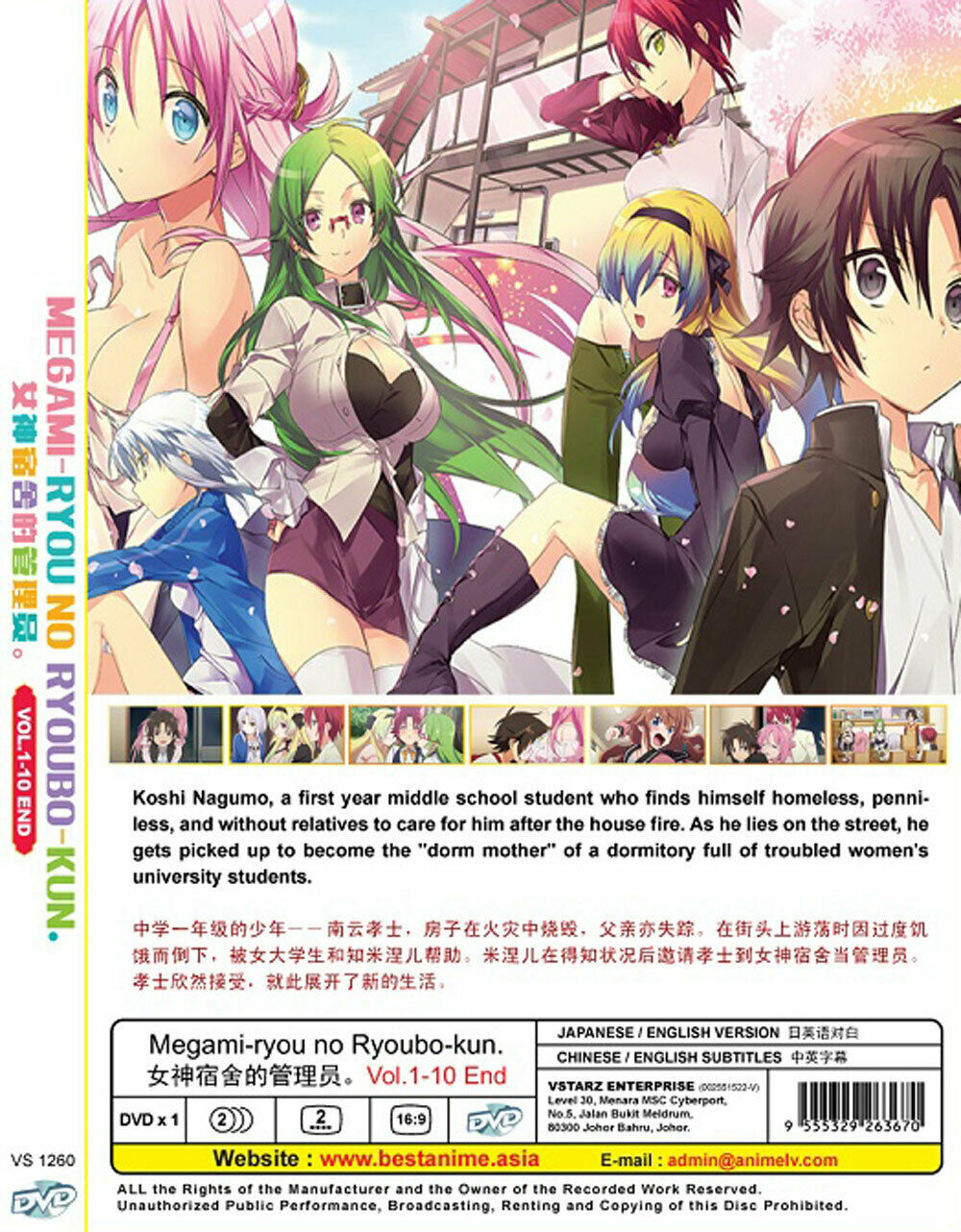 After learning of Koushi's situation, Mineru, who happens to be the temporary manager, invites him to become Megami-ryou's official dormitory mother. However, what awaits him are the dorm's residents—each with their own wacky shenanigans—like the androphobic yet gentle Atena Saotome, the feminine tomboy Kiriya Senshou, and Mineru herself, whose recklessness knows no bounds when it comes to science. Despite this, Koushi does his best to fulfill the duties of this crazy new life!