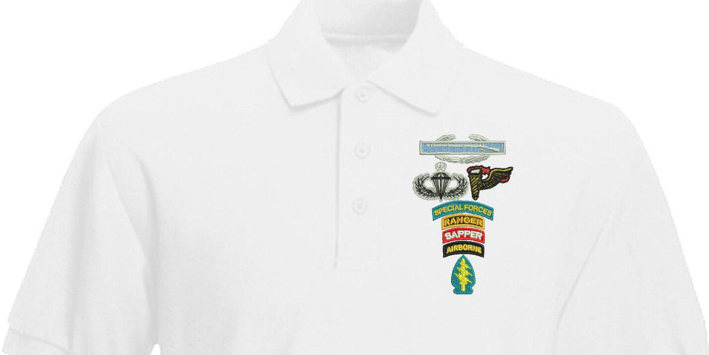 One Men's Polo Shirt with embroidered Special Forces CIB Sapper Ranger Airborne Arrowhead with Master Wings and Pathfinder design as pictured