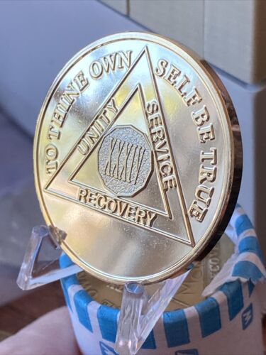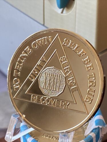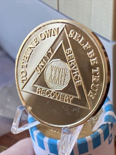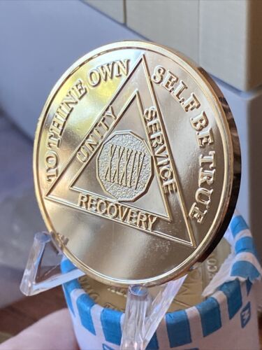 The medallion features the number "34" on the front, representing 34 years of sobriety. It is also engraved with the AA logo and the words "Unity", "Service", and "Recovery". This token is perfect for commemorating a milestone in your sobriety journey or as a reminder of the principles of the program. Don't miss out on the chance to own this beautiful gold-plated AA medallion.