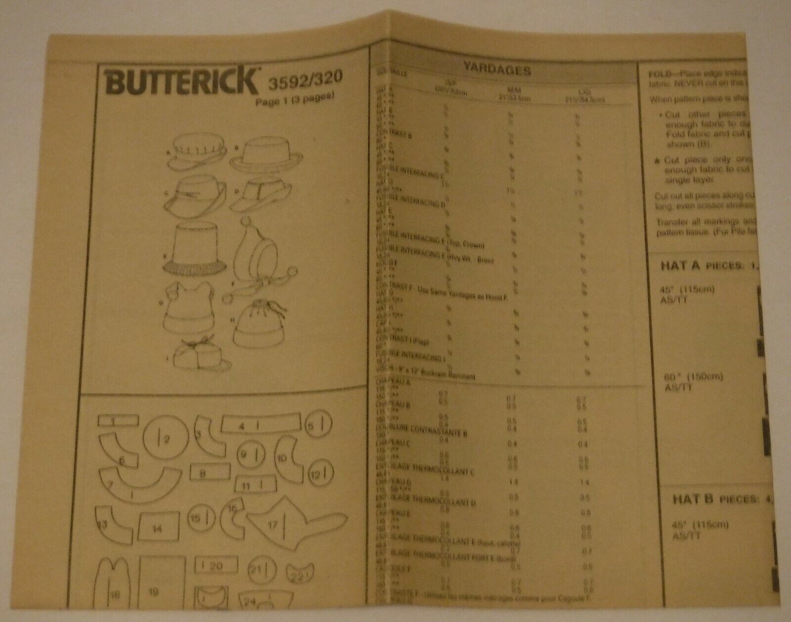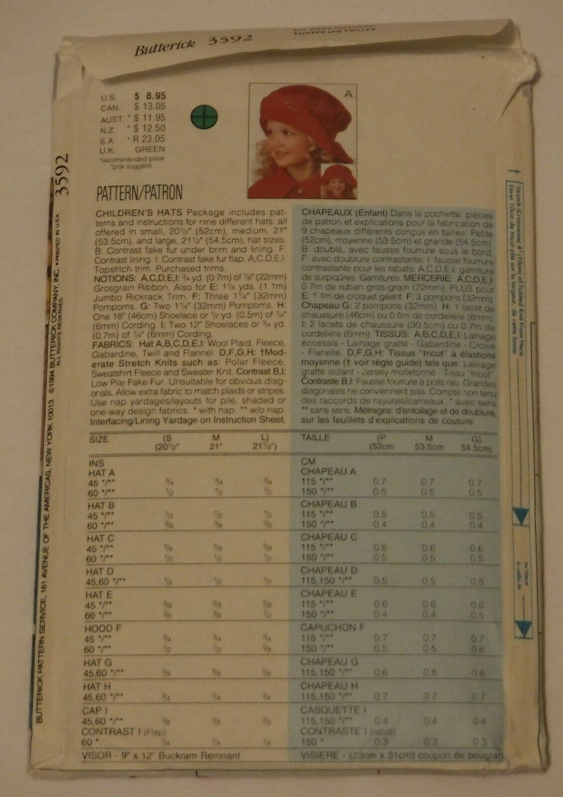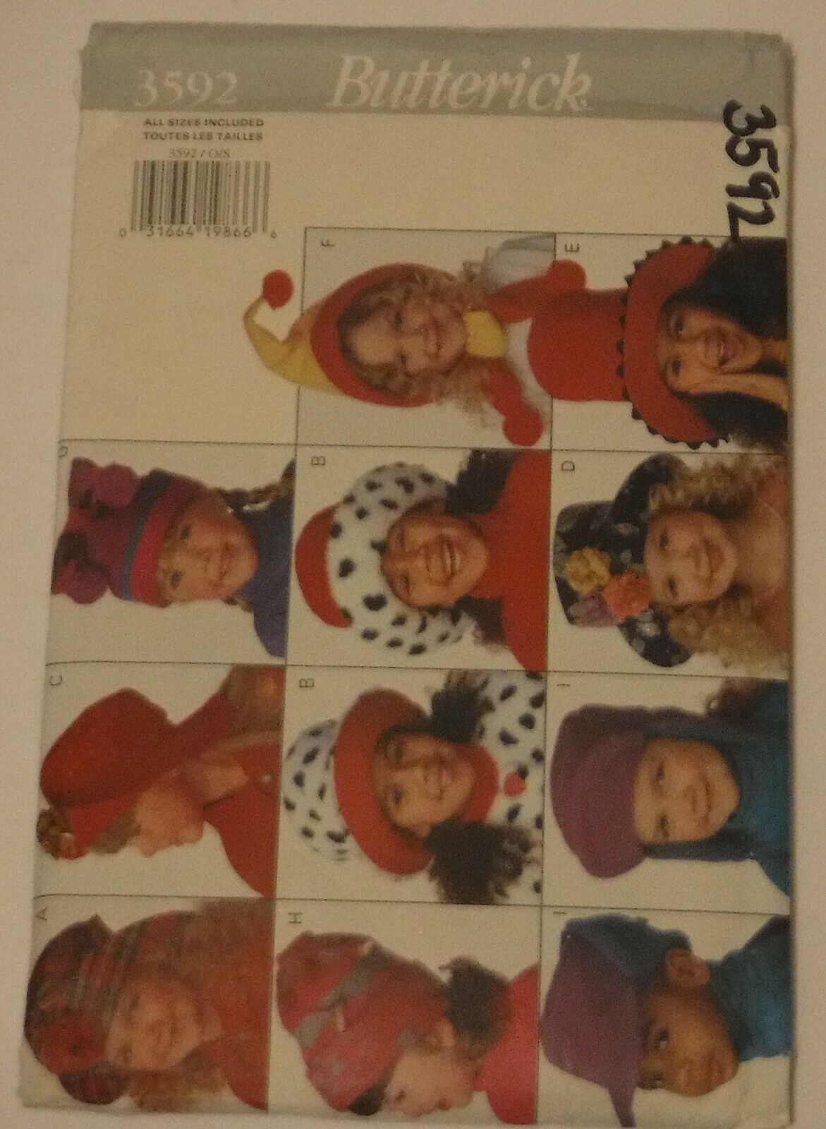Butterick Sewing Pattern # 3592 Children's Hats Uncut