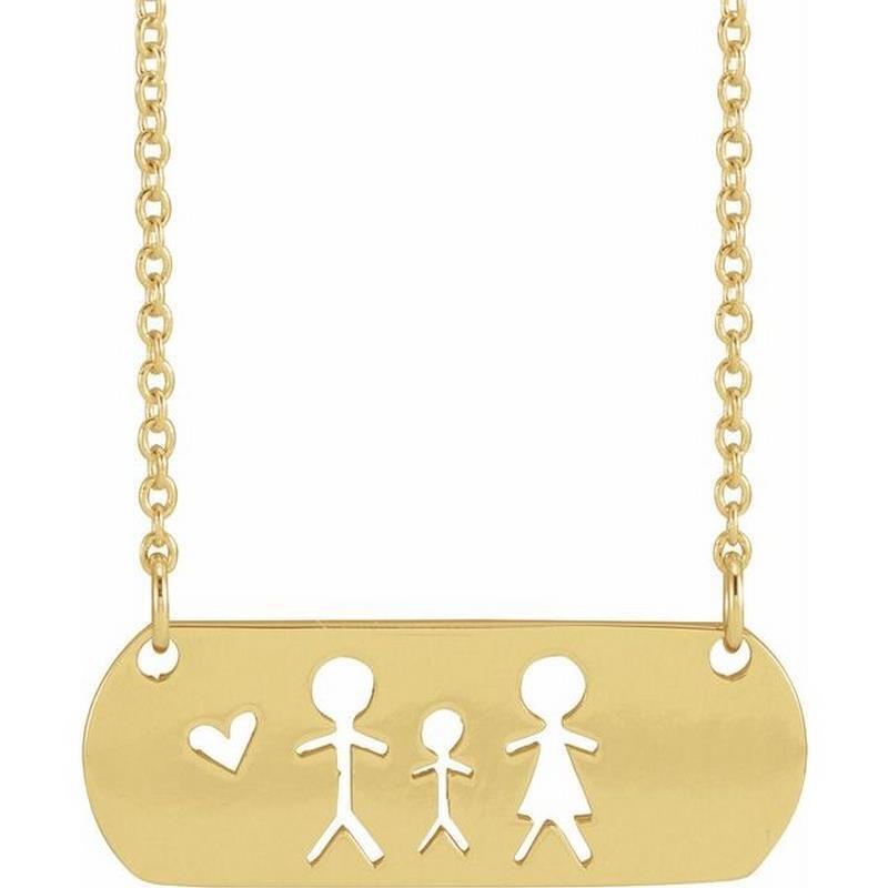 This bar-style 14k yellow gold necklace features a pendant with a father, son and mother stick figure cut-out along with a cut-out of a heart. The chain secures with a spring ring. Makes a perfect Mother's Day gift.