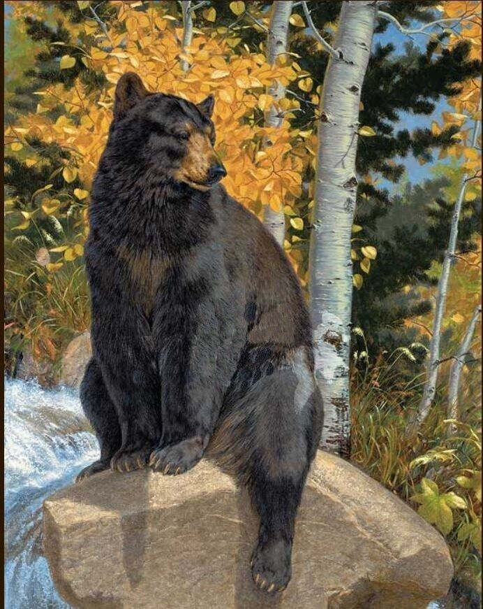 ?In this piece I wanted to give the bear a casual look, yet still untamed. I also wanted his dark shimmering coat to jump out in contrast to the gold hues of aspen and light rocks.? Lee Kromschroeder