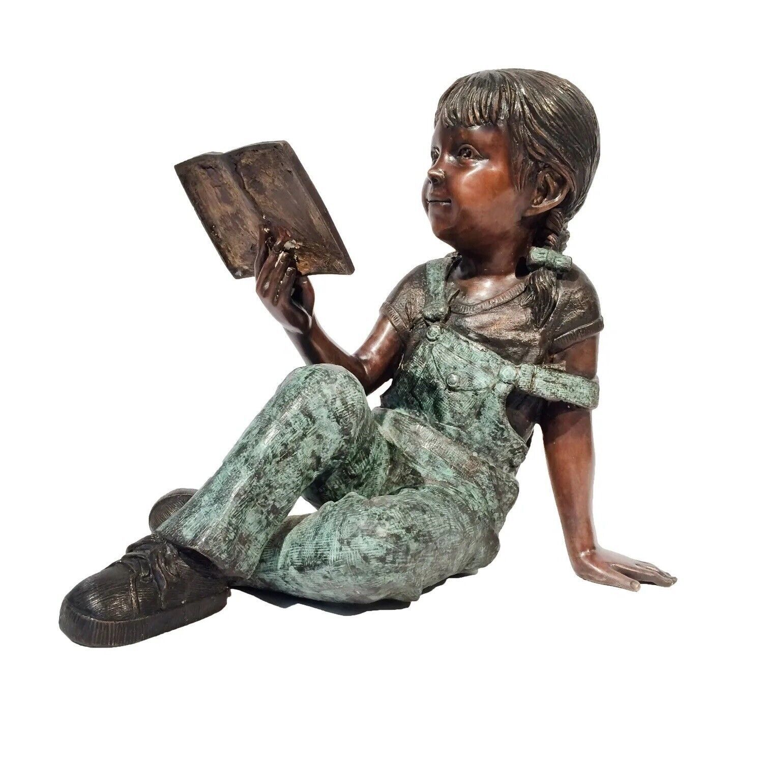 This life-like bronze tabletop sculpture features a girl sitting while reading a book. The statue is created using the labor-intense time-honored lost wax bronze casting method. The sculpture features a beautiful brown and green fire-applied patina to complement any decor.