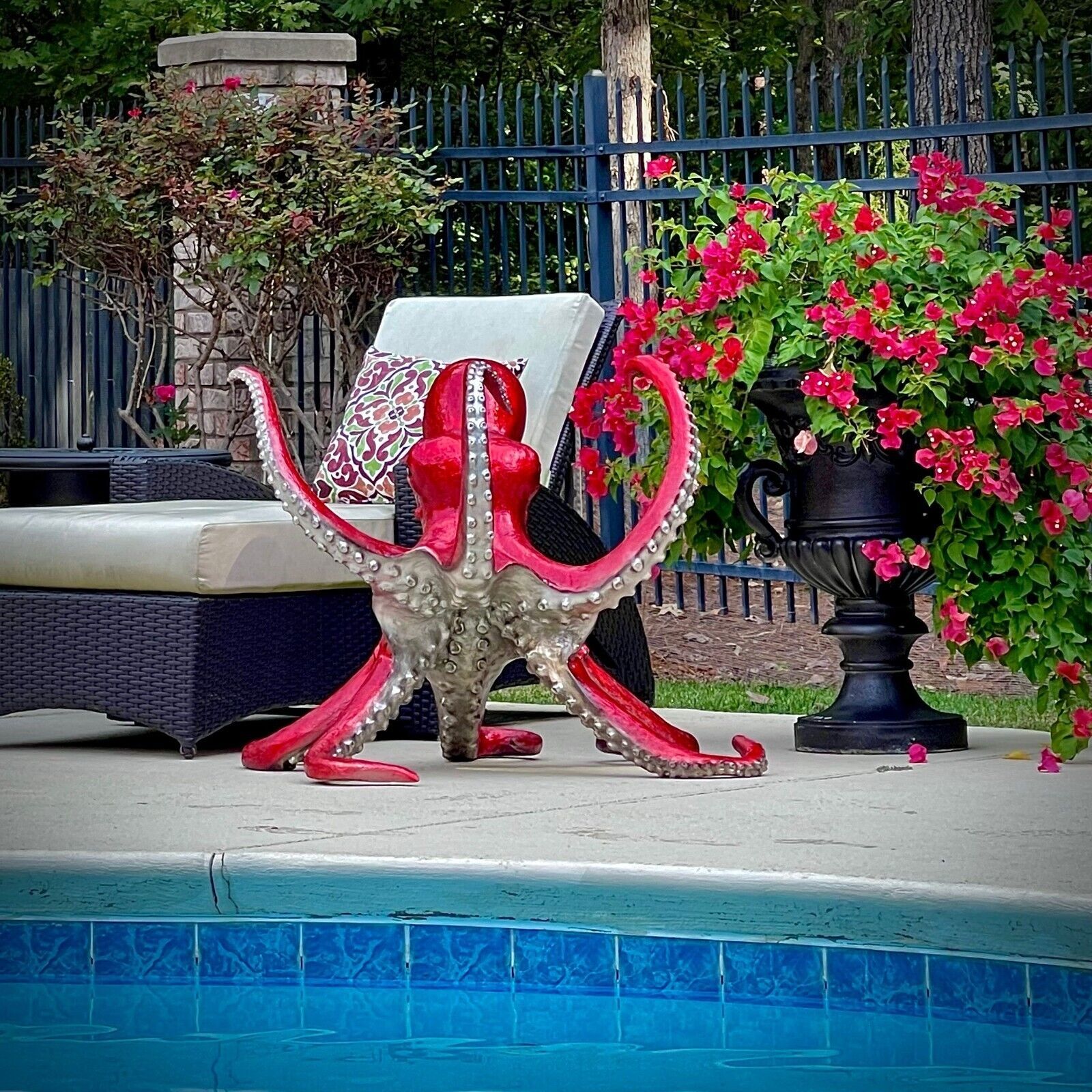 This bronze octopus table base features a stunning coral and silver finish. It can be used as a centre hall table, breakfast or dining table, or sculpture.