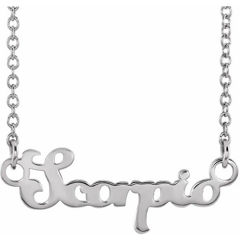 This is a platinum Scorpio Zodiac center pendant is suspended on an 18-inch cable. The chain secures with a spring-ring.