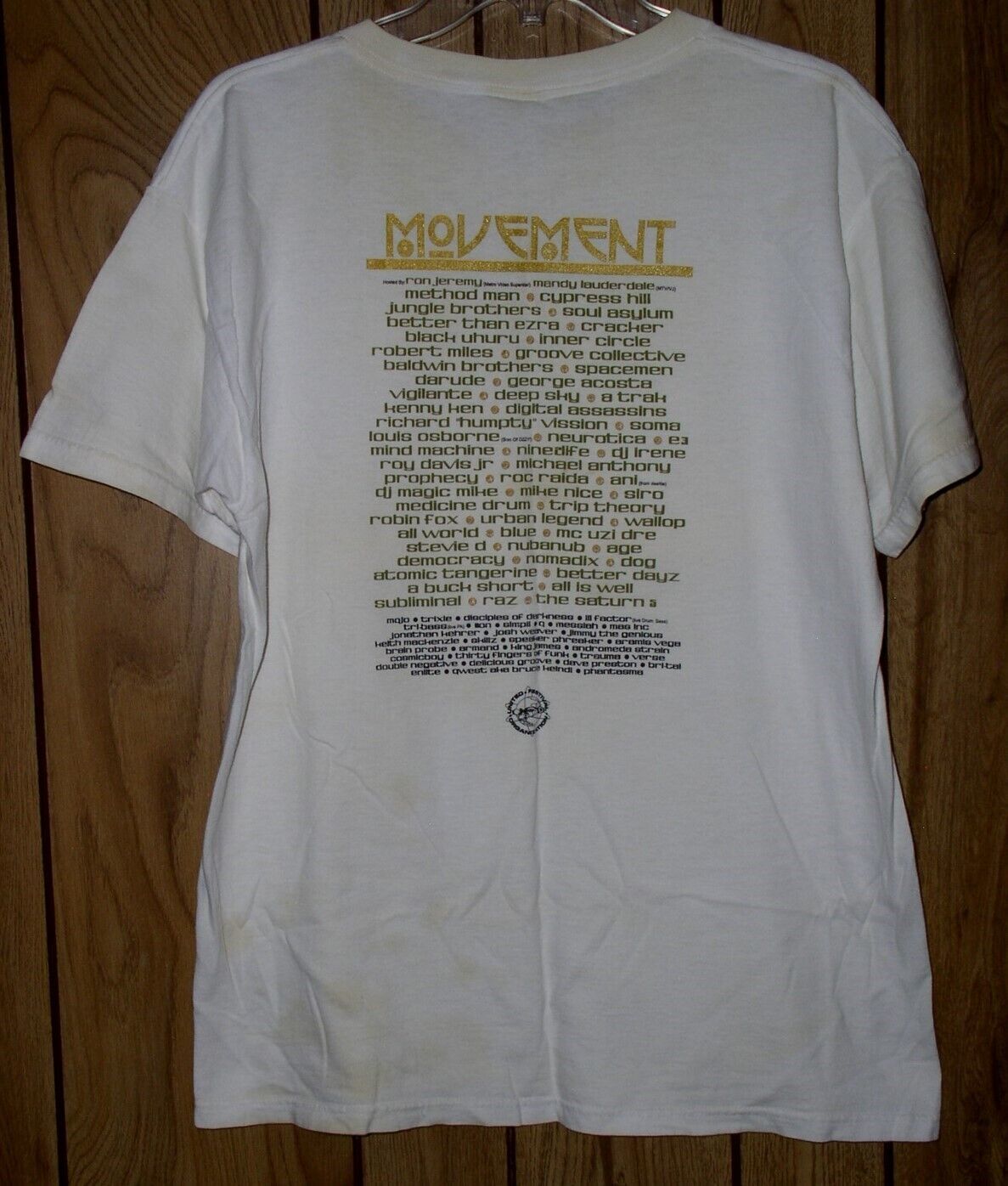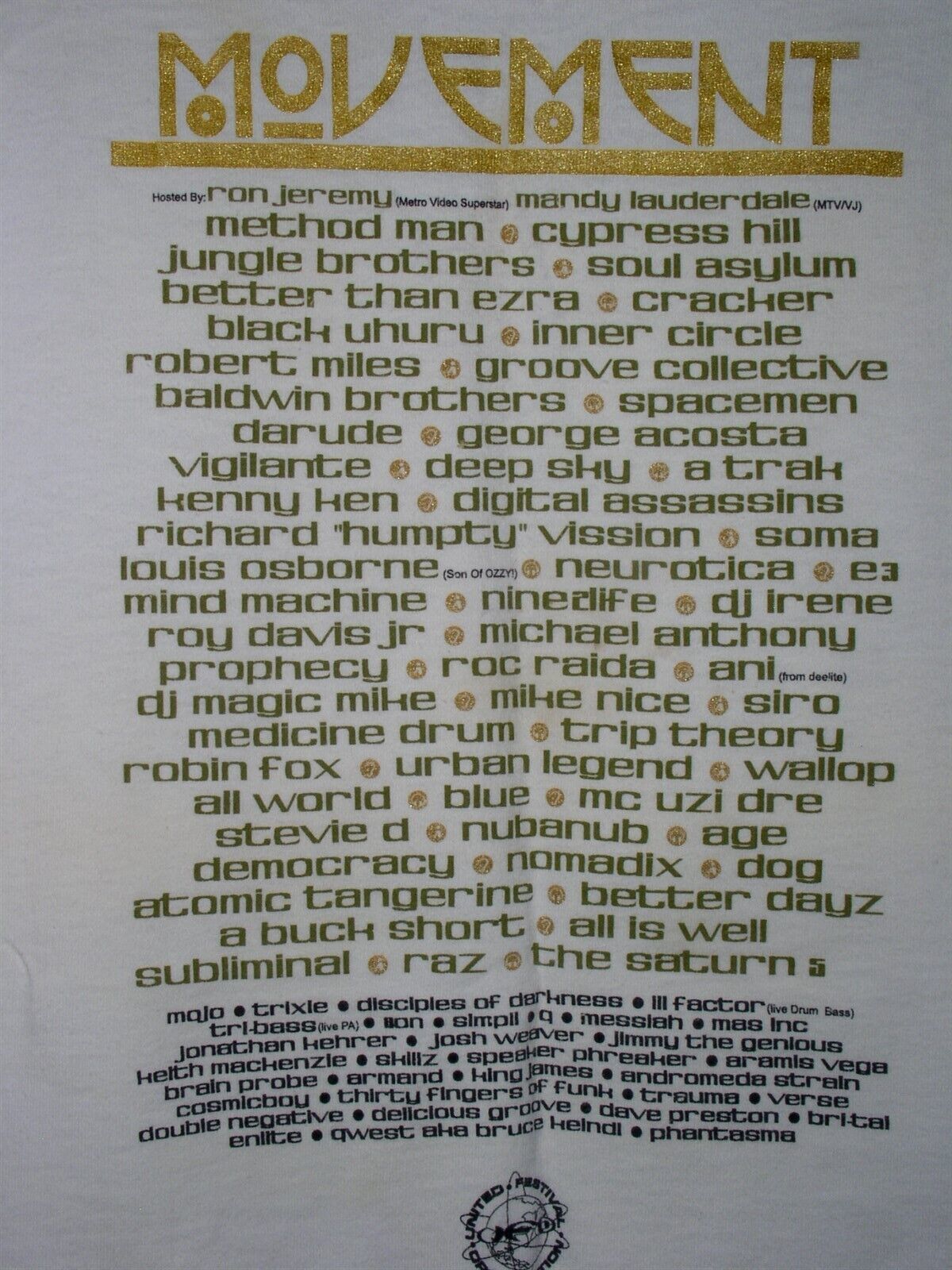This is a vintage concert t shirt entitled, "Movement Festival To Change The World, Sunday September 2, 2001". Hosted by Ron Jeremy and Mandy Lauderdale. This is a one-off concert event, making this a very scarce collectible. Research has this concert as being held in Tampa Florida on this date. Gold glitter print on both front and back makes this all the nicer. Tag reads: Fruit of the Loom Heavy Cotton. A terrific item for the fan or collector.