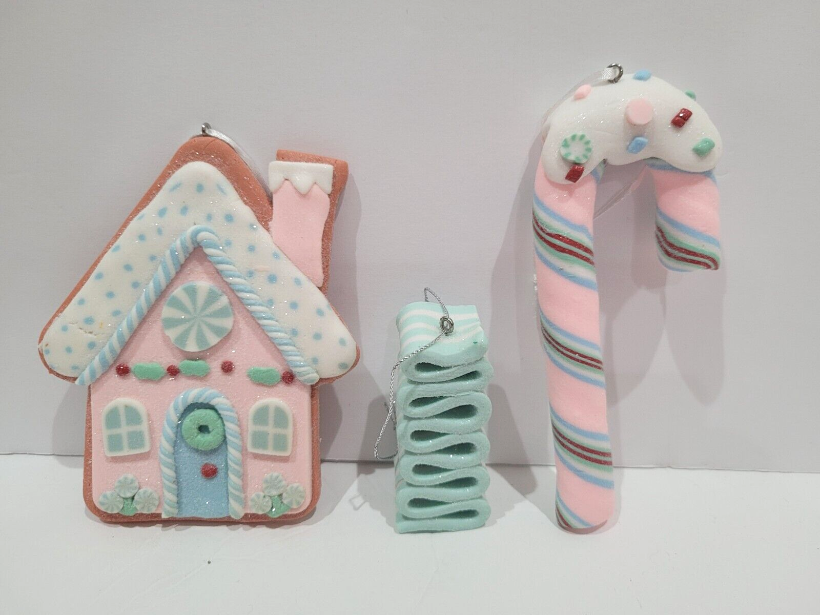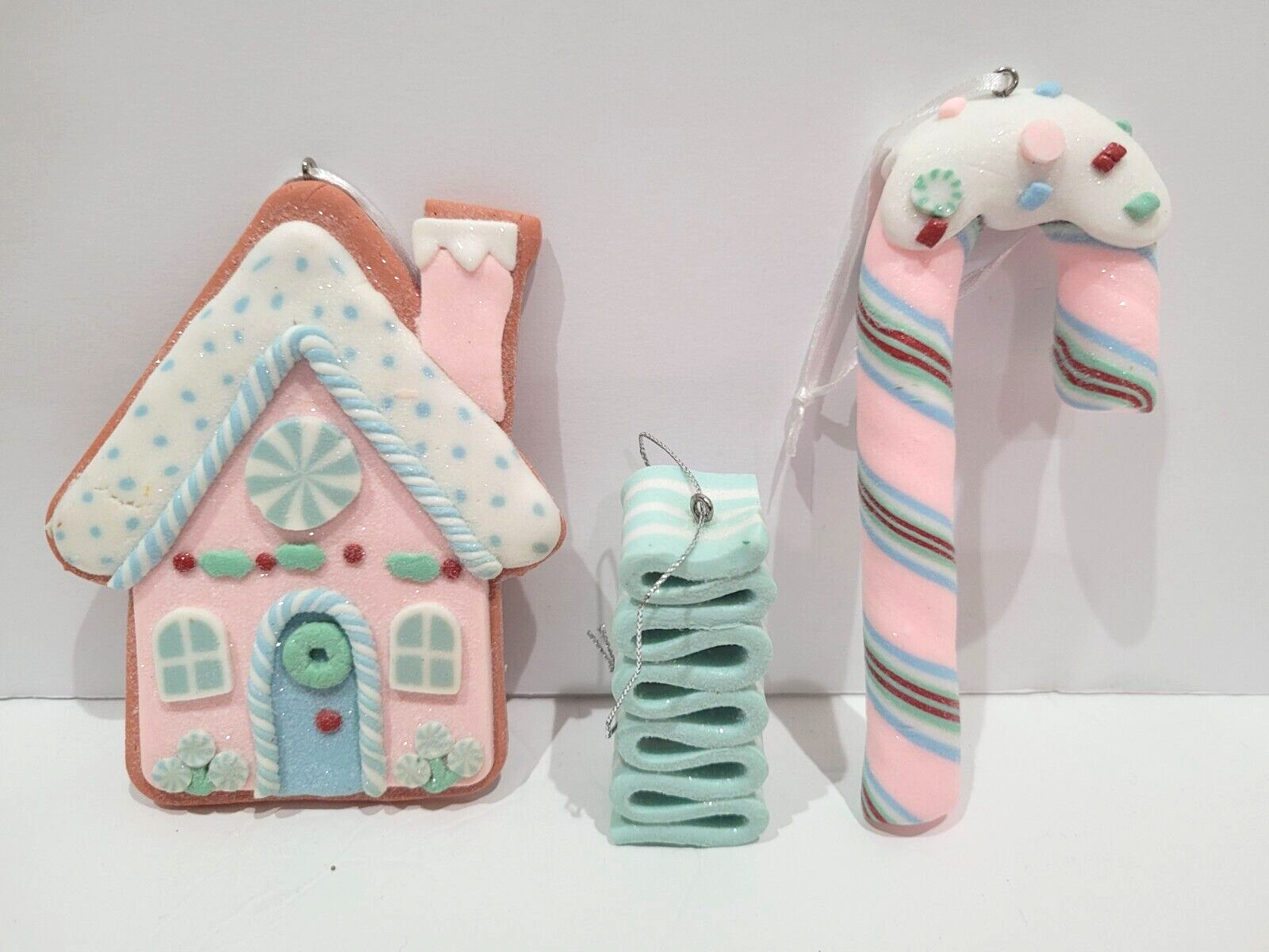 Up for sale we have a set of 3 adorable pastel gingerbread ornaments for your tree decor. These are sooo cute and will look amazing with your decor. Made out of clay dough (I believe). These are so pretty they have glitter on them. I also have many more gingerbread decor in my store