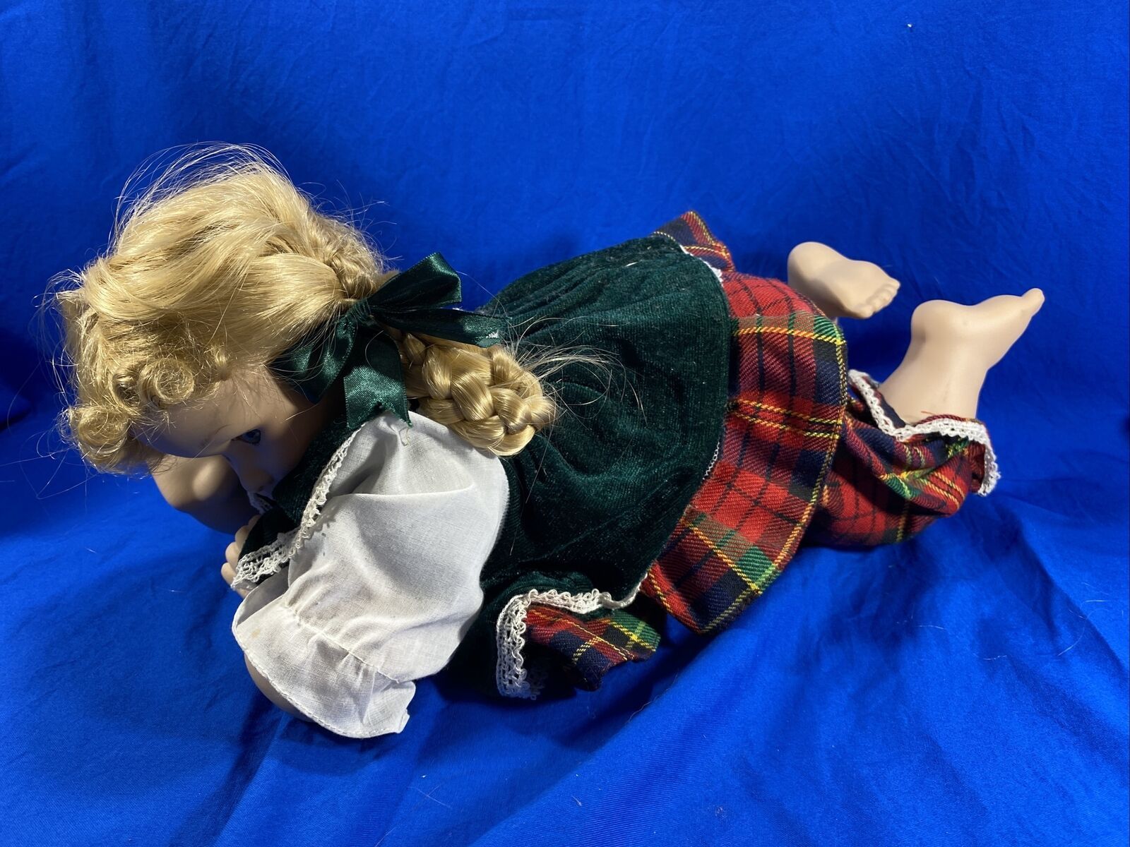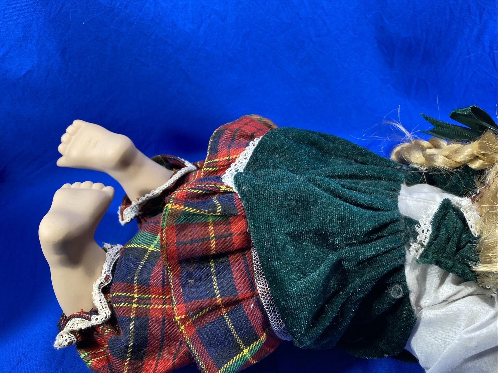 Unique 1-5000 PORCELAIN DOLL Soft Body lays on her belly in Plaid Outfit. Condition is Used. Shipped with USPS Priority Mail.