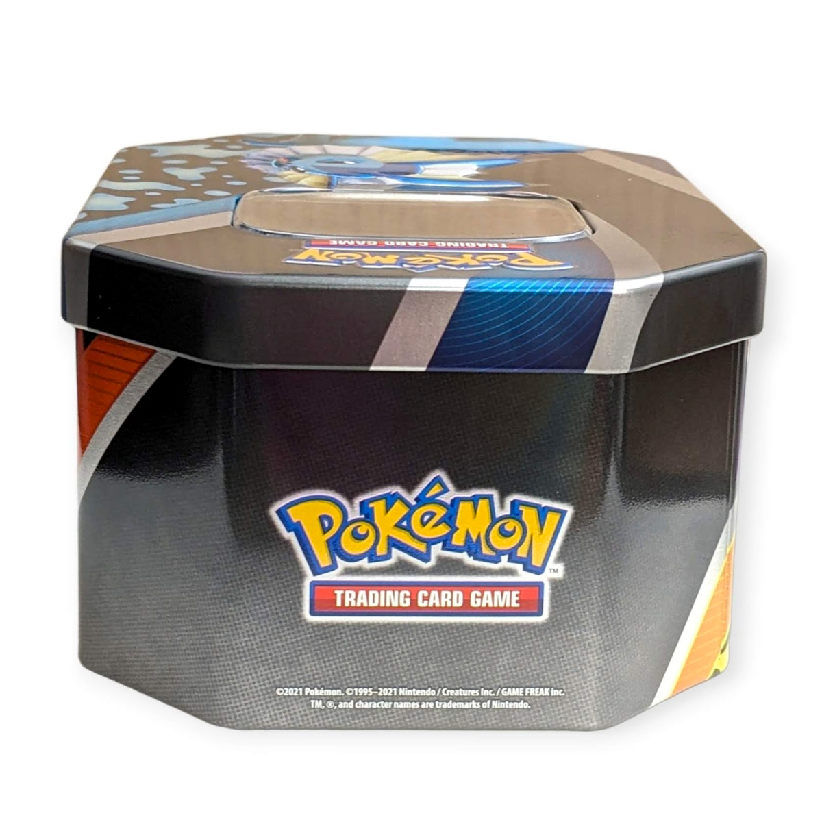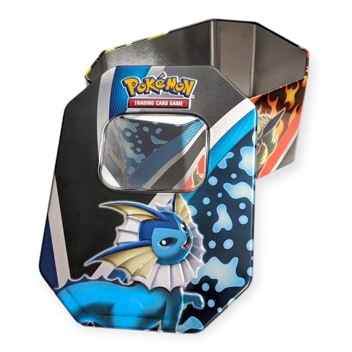 • A Vaporeon themed tin with additional artwork featuring Flareon and Jolteon.