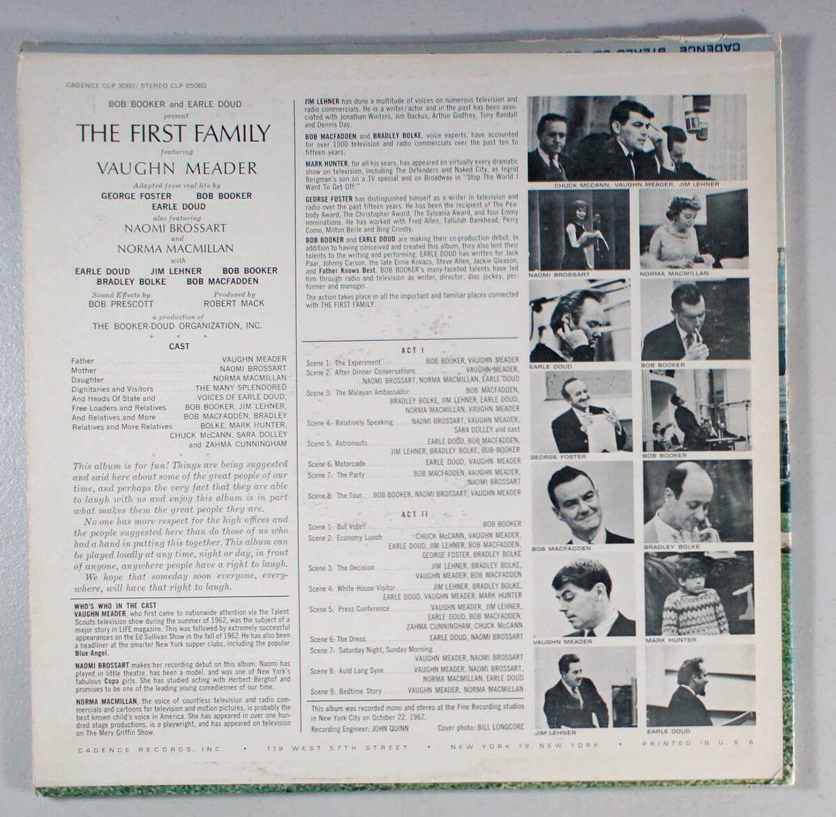 The First Family is a comedy album, a good-natured parody of President John F. Kennedy, both as Commander-in-Chief and as a member of a large, well-known political family. The album was honored as the "largest and fastest selling record in the history of the record industry" selling at more than a million copies per week for the first six and one-half weeks in distribution, by January it had sold more than 7 million copies. Cadence president Archie Bleyer credited the album's success to radio airplay.