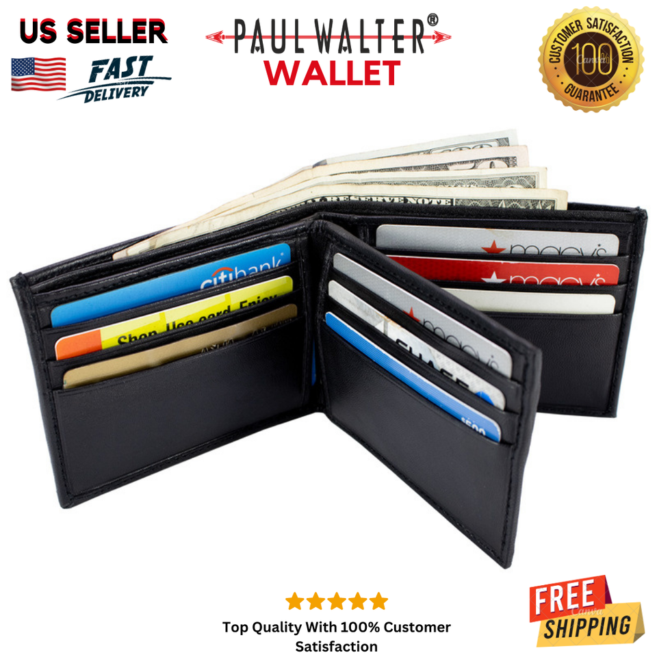 Paul Walter - Men's Bi-fold Lambskin Leather Black Wallet Multi ID Pockets Classic Card Style Wallet (LW-11 BK)