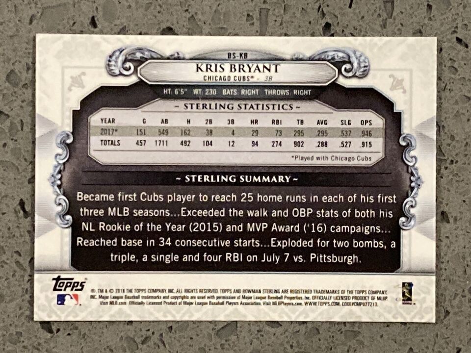 2018 Bowman Sterling Continuity #BS-KB Kris Bryant $2.88 B3G1 Sale