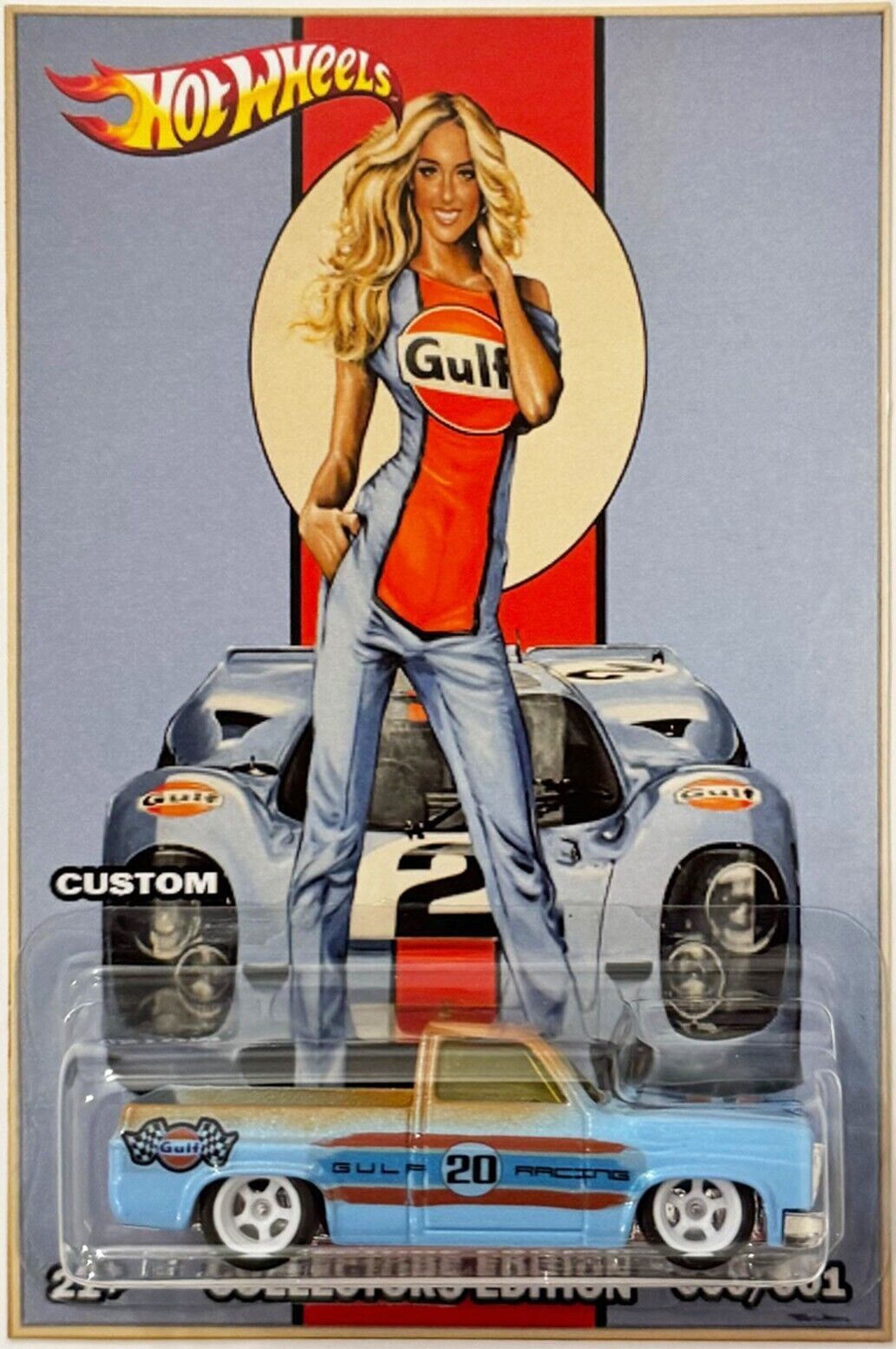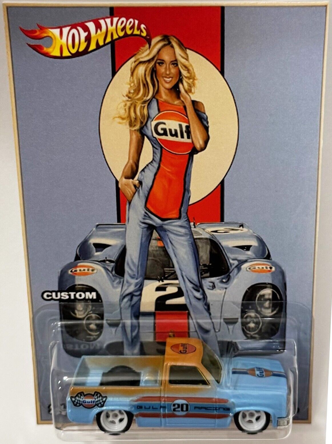 '83 Chevy Silverado Custom Hot Wheels Gulf Racing Series Collectible Car with Real Riders Rubber Wheels.