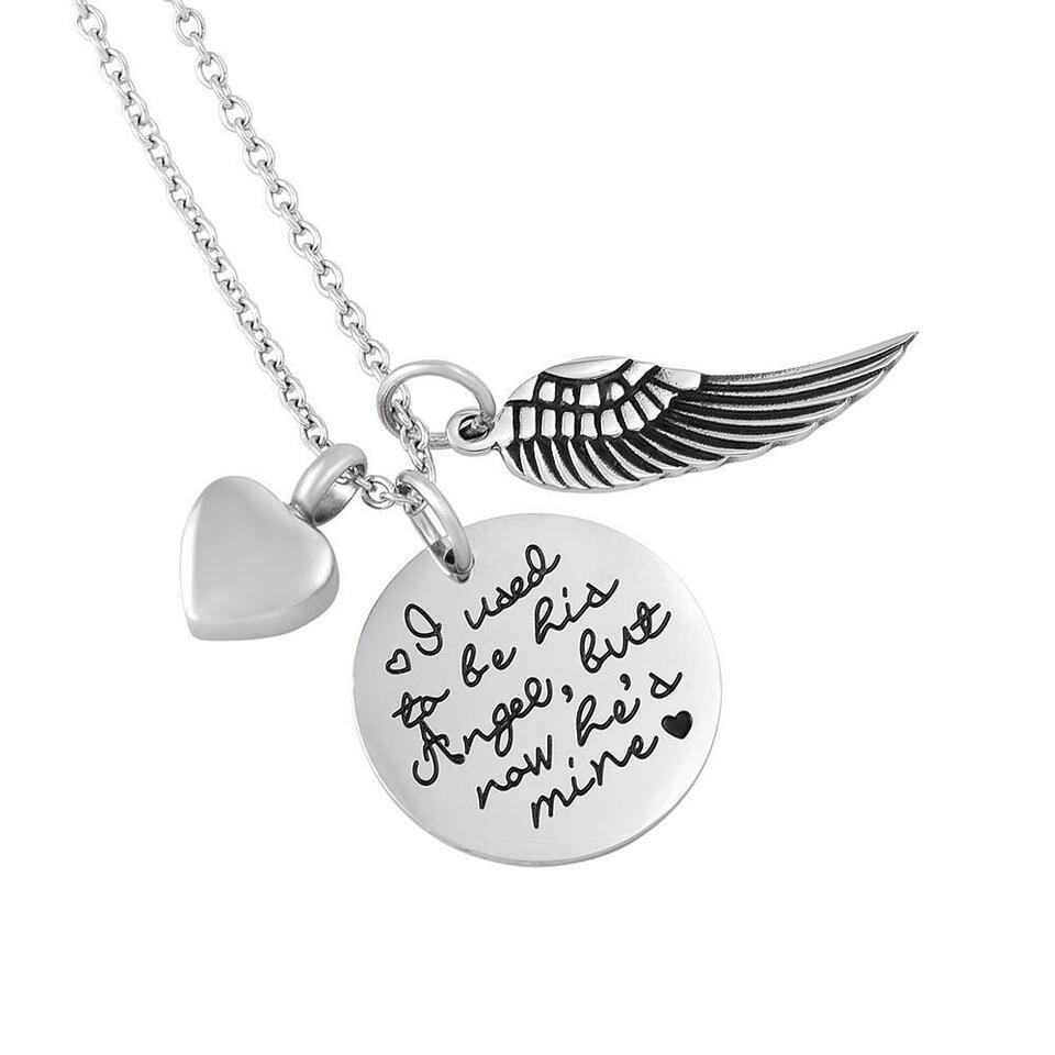 "I used to be his Angel but now he is mine" Circle Cremation Urn Pendant w/Chain
