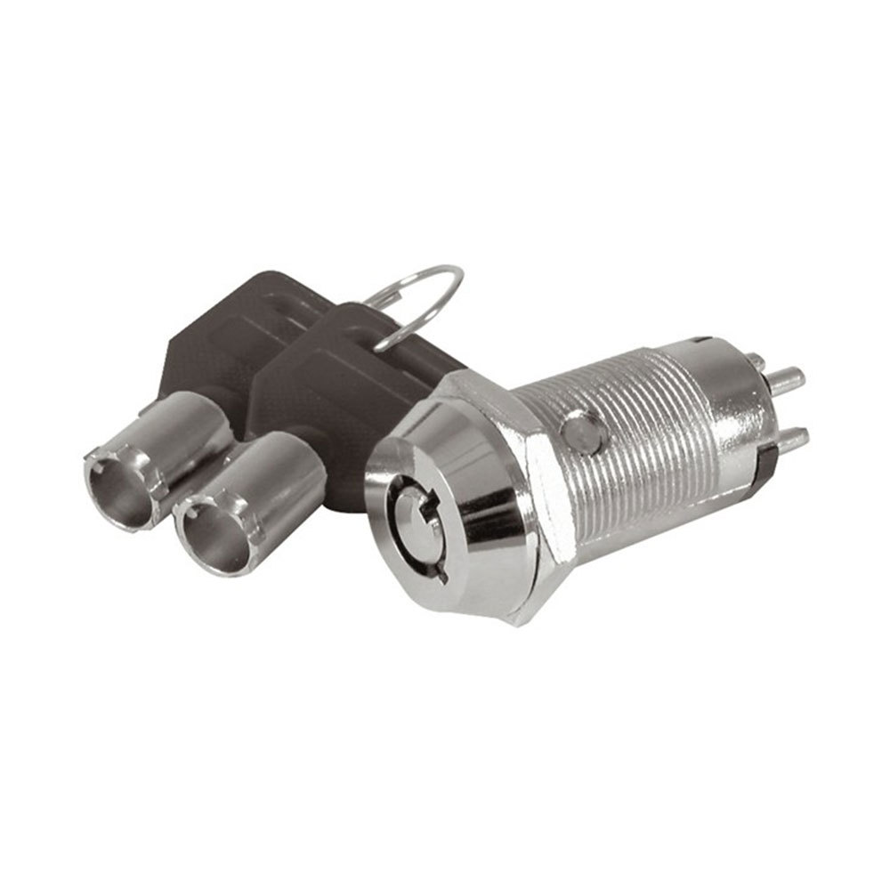This keyswitch uses tubular keys with black plastic inserts to easily identify them. It has 2 positions and the key is removable from both. There are 4 connection terminals, however, it is not a regular Double Pole Single Throw (DPST) switch, but rather a dual Single Pole Single Throw (SPST) change-over switch as each pair of contacts is in the opposite state to the other.