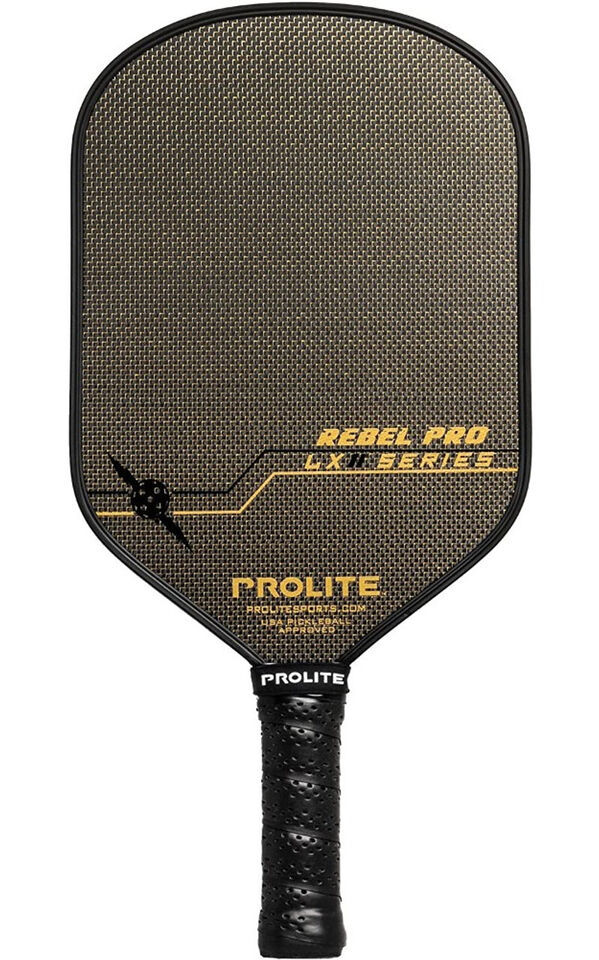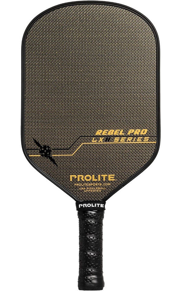 The Rebel Pro LX is designed for the pickleball player looking for headweighted balance, a blend of power and control, and an elongated/oversized face with extra reach for each shot. The Hyperweave Carbon Fiber utilizes a tighter cross weave interwoven with gold or silver fibers increasing uniform strength, speed, and consistency in each shot. Because it is constructed of a total of 3 layers of carbon fiber surrounding each side of the paddle core, it results in an overall 14 mm thickness improving feel, durability, and increased vibration dampening qualities. PROLITE?s flagship 14mm core thickness provides the optimum balance of feel and vibration absorption without sacrificing power like most thicker cored paddles. Custom designed hybrid end cap that brings the tennis and pickleball worlds together. Exclusive edge guard with the Aero Channel running the length of the paddle face. The channel allows air flow through the depression of the edge creating less drag.