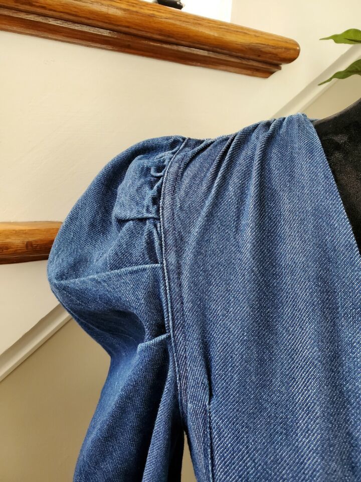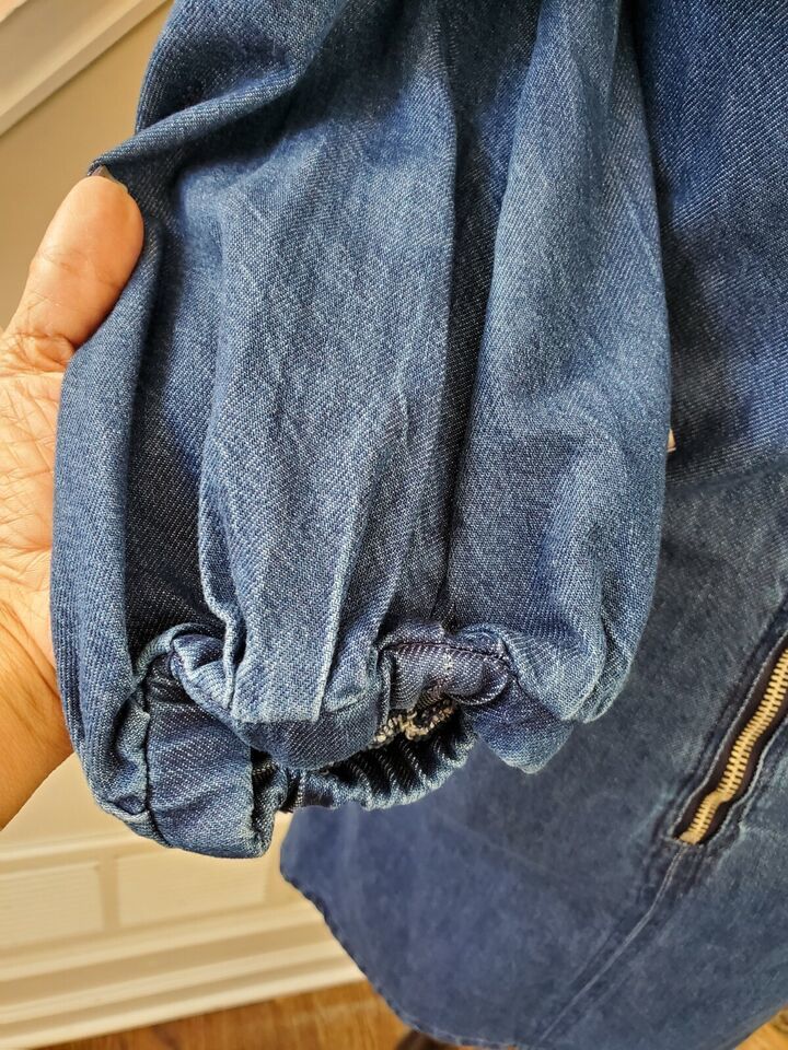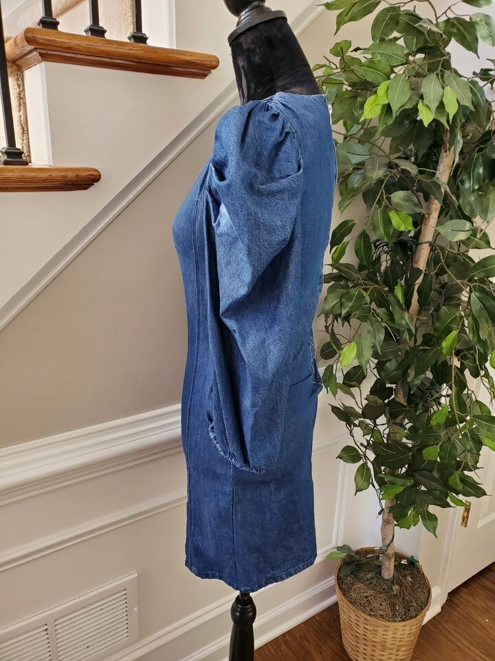 Zara Women's Blue Denim Cotton V-Neck Balloon Sleeve Knee Length Dress Size XS