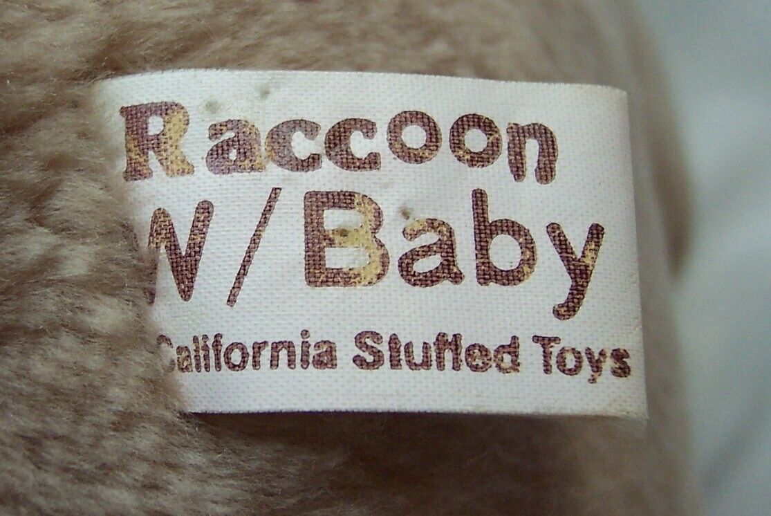 This is a VINTAGE CUTE RACCOON Plush Stuffed Animal Toy. Made by California Stuffed Toys. It is 10 inches tall. It is in great condition. The hands stick together if you want. The tush tag says "Raccoon W/ Baby" but the baby is not included. The plush is CLEAN! No Stains, Tears or Defects. Combine auctions to save on shipping. Please contact me if you need to make other payment arrangements. EAG