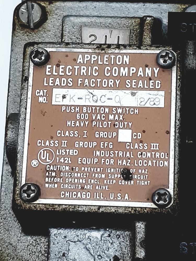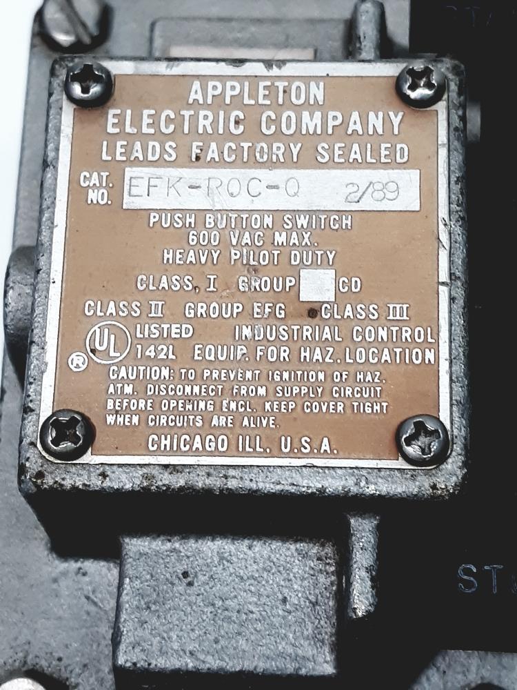 Appleton EFK-ROC-0 2/89 Rocker Switch Cover Assembly 600 VAC 10 Amp, Momentary