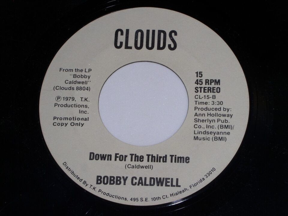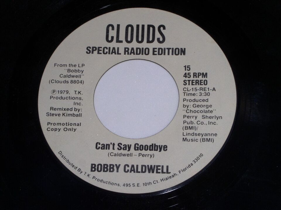 This is a vintage promotional 45 rpm phonograph record by Bobby Caldwell , entitled, "Can't Say Goodbye". Flipside: "Down For The Third Time". Record label: Clouds CL-15.