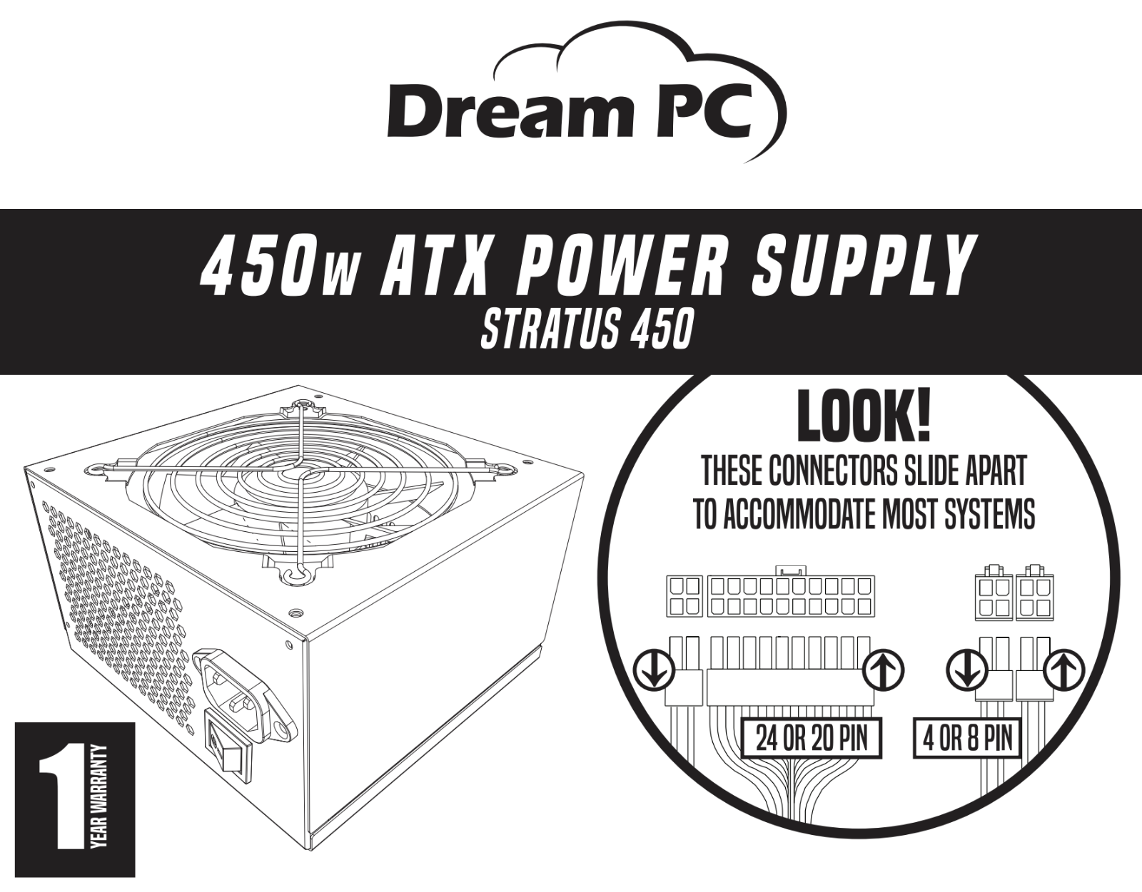 This Works as both 20 pin and 24 pin Main Connector; simply slide the 4 pins off the end of the connector.