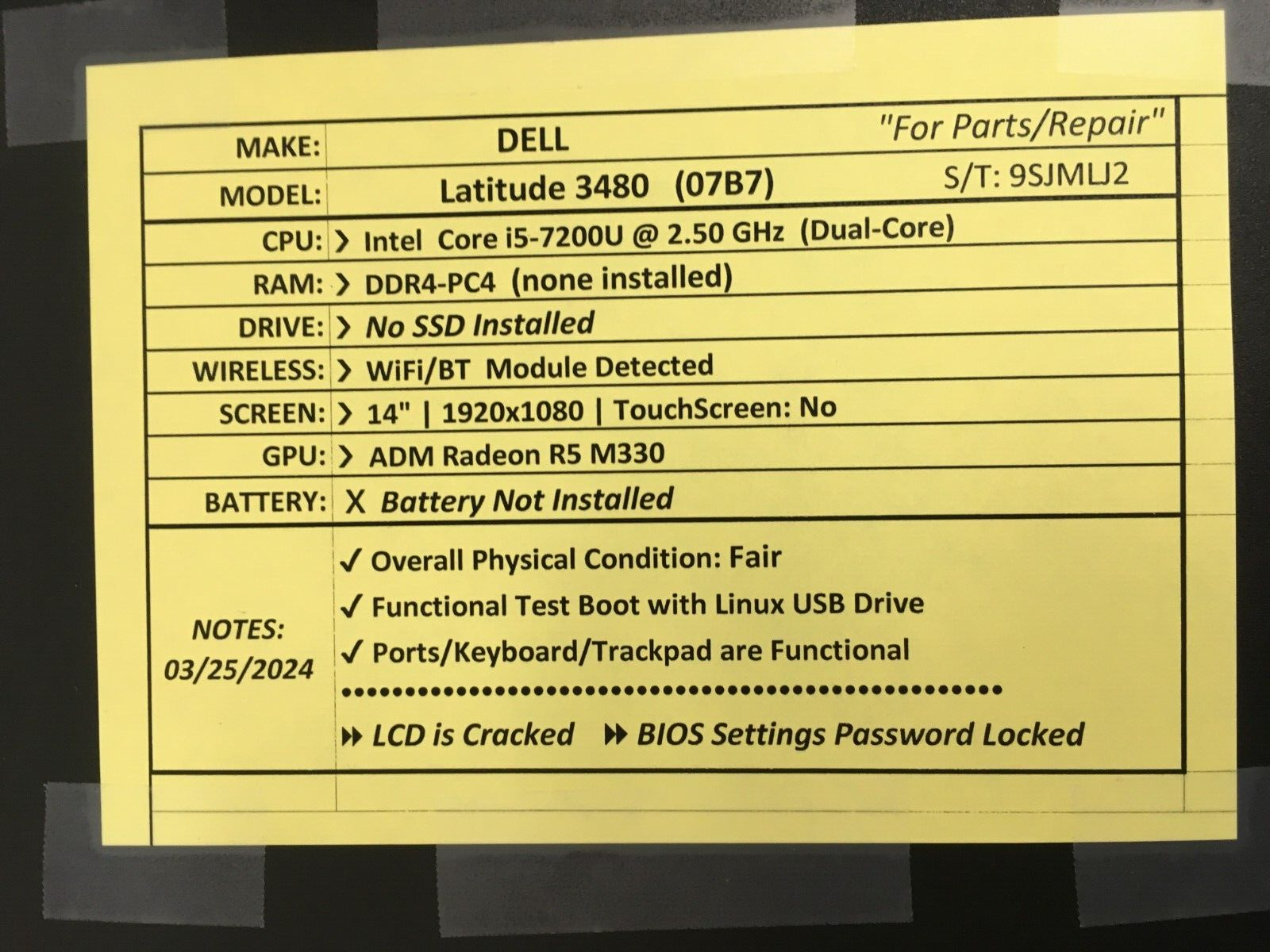 Notes 03/25/2024: Overall Physical condition: fair, functional test boot with Linux USB drive, Ports/keyboard/trackpad are functional , LCD is cracked, BIOS Settings Password Locked