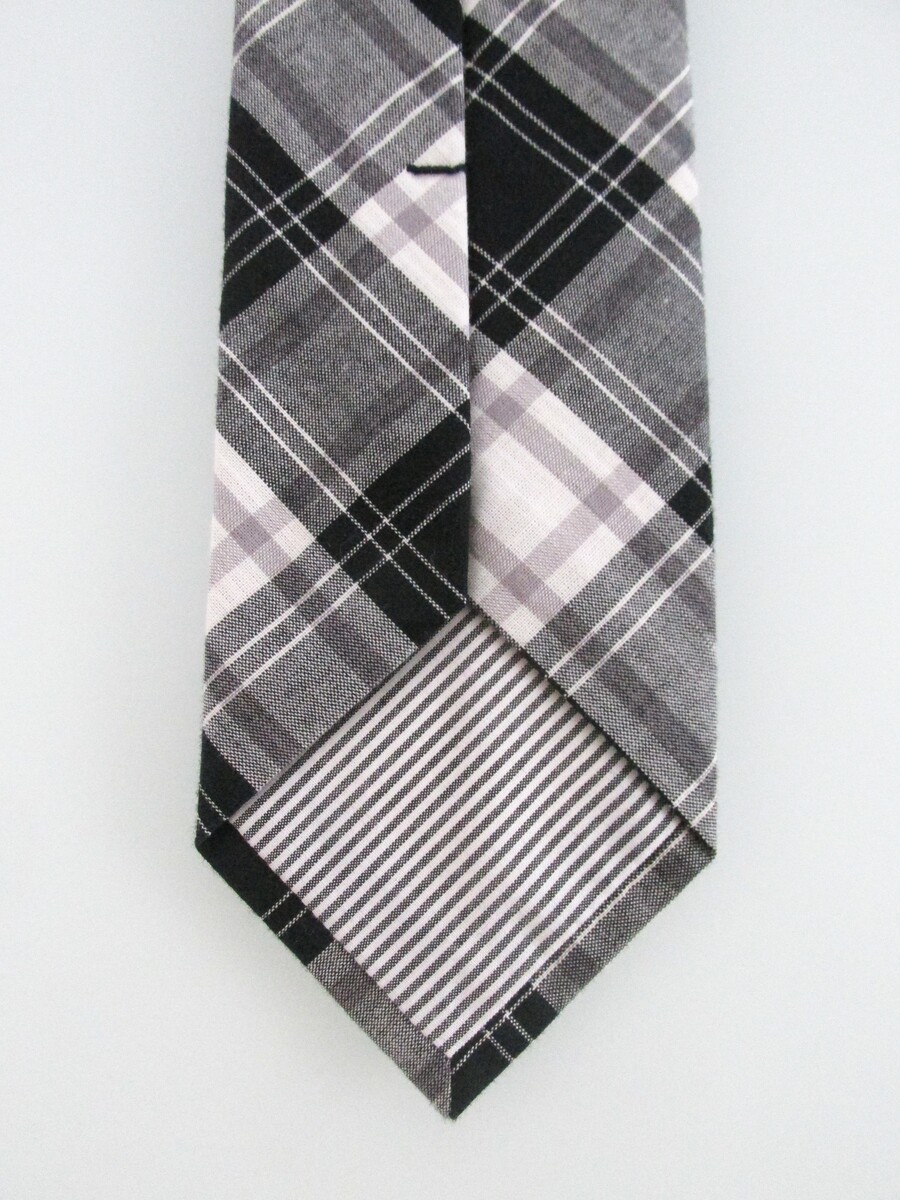 Description: Up for sale is an men's unbranded narrow cotton plaid tie. The tie is handmade of 100% cotton. The tie has a multicolored plaid pattern in black, gray, white. The dimensions are approximately 58" long x 2.50" wide. This tie is in like new condition.