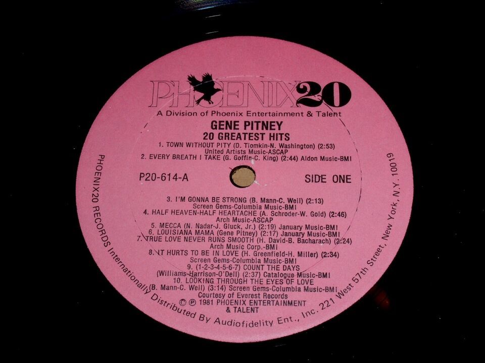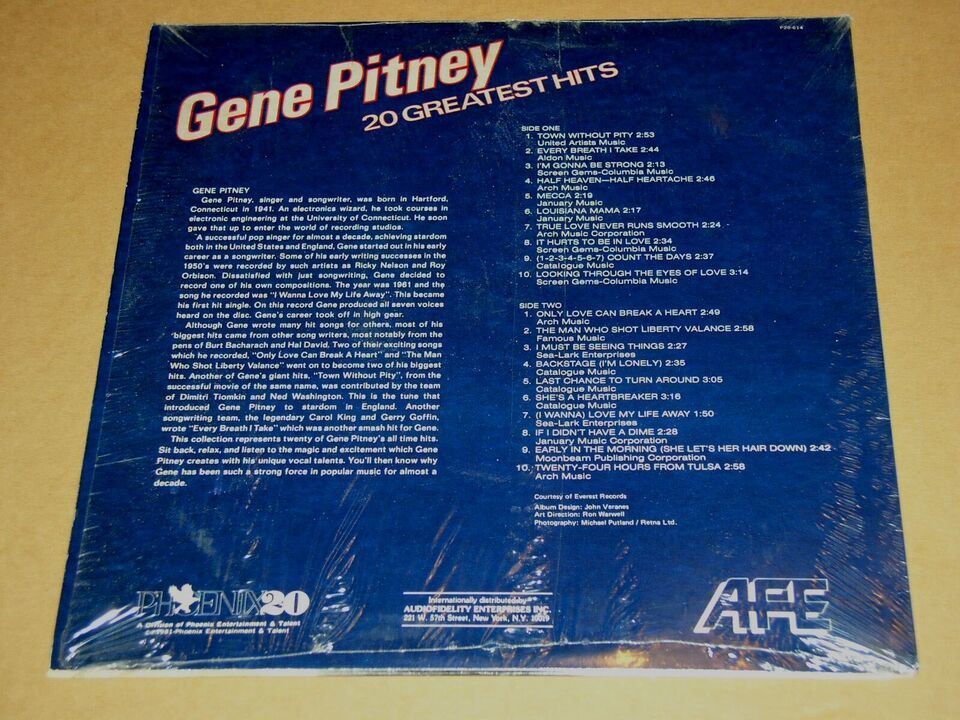 This is a vintage phonograph record album by Gene Pitney entitled, "Gene Pitney 20 Greatest Hits". Record label: Phoeniz P20-614. Original shrink wrap tightly on the cover.