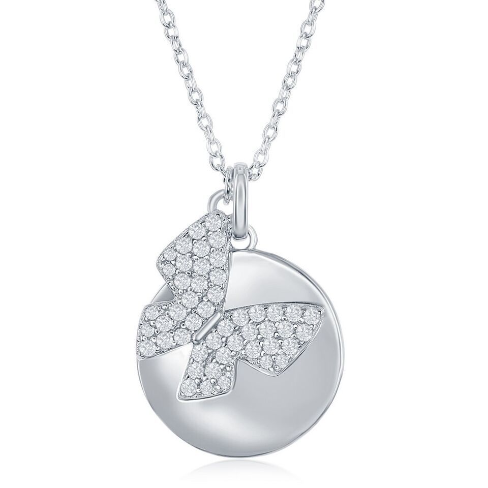 Sterling Silver Shiny Disc with Micro Pave Butterfly Necklace