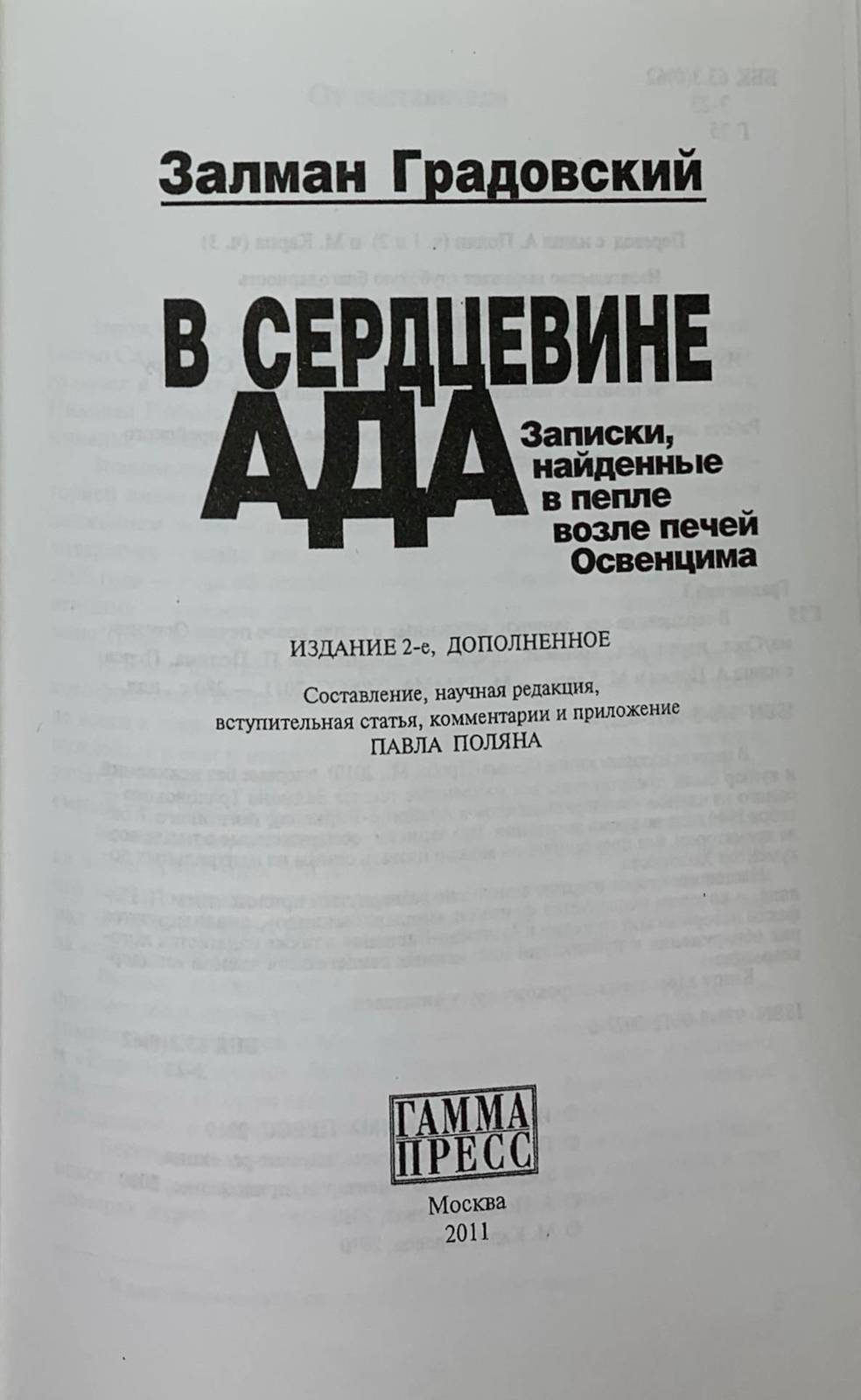 In Russian. Short description: Gradovsky Z. In the heart of hell. Notes found in the ashes near the ovens of Auschwitz. Compilation, natschn. Ed., comment., foreword. And P.Polyan's application. Transl. From Yiddish A. Polyan and M. Karpa.- M.: GAMMA-PRESS, 2011.-280 p., ill. In the first edition of the book (Gamma-Press, M., 2010), for the first time, without distortion and cuts, all the found texts of Zalman Gradovsky, one of the members of the Sonderhommando in Auschwitz-Birkenau, who died on October 7, 1944 during the uprising, were presented. His notes, found in the ashes near the crematorium, without exaggeration can be called one of the central documents of the Holocaust. This second edition is supplemented by a detailed appendix by P. Polyan, which explores the Sonderkommando phenomenon, analyzes the facts of the historical tragedy in Auschwitz-Birkenau, and also describes the history of the discovery and publication of written testimonies of Sonderkommando members. Please feel free to contact us for a detailed description of the copies available. SKUMS002102