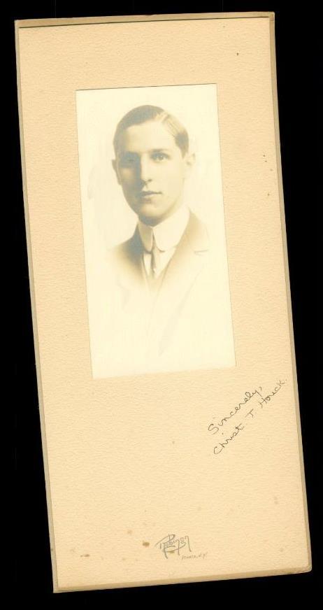 Vintage Photo 1900s Christian T Houck Genealogy Robinson Studio Ithaca New York. Roughly mid 19 teens as he was born in 1893. Dapper suit. No smoke or pet odor. Photo mounted on card stock folder. Actual photo size is 5.5" by 2.75" and he has signed his name below.