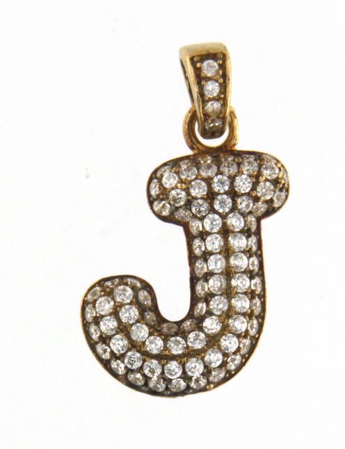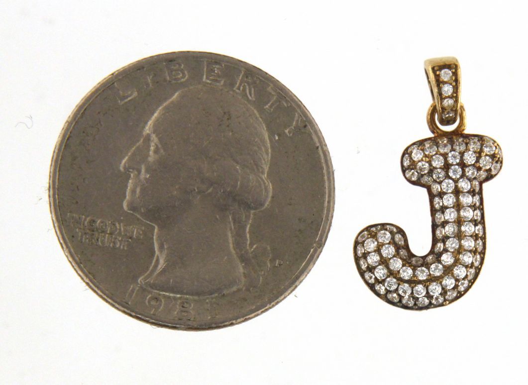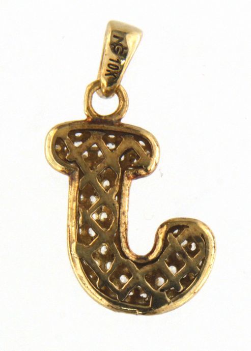 Type: CharmWeight: 1.1Karat: 10ktMetal: Yellow GoldGender: UnisexStyle: InitialSize / Length: 0.75"Owner applied: 10KStone 1 quantity: 88Stone 1 shape: RoundStone 1 color: ClearStone 1 weight (total): 0.88Brand: "J"Stone 1 type: Cubic ZirconiaCondition:UsedNotes:Charm is missing 1 stone in bale.