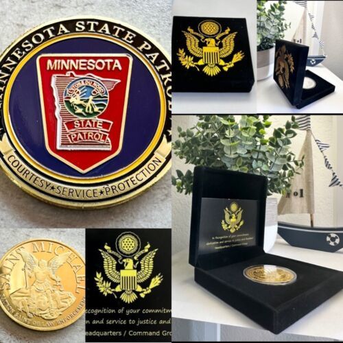 This is a beautiful Minnesota State Police challenge coin. Coin is about 1 9/16" in diameter and raised lettering on both sides and gold plated with a reeded edge. Reverse side has St. Michael the Protector, Patron Saint of Law Enforcement. Coin is contained in an air tight holder.