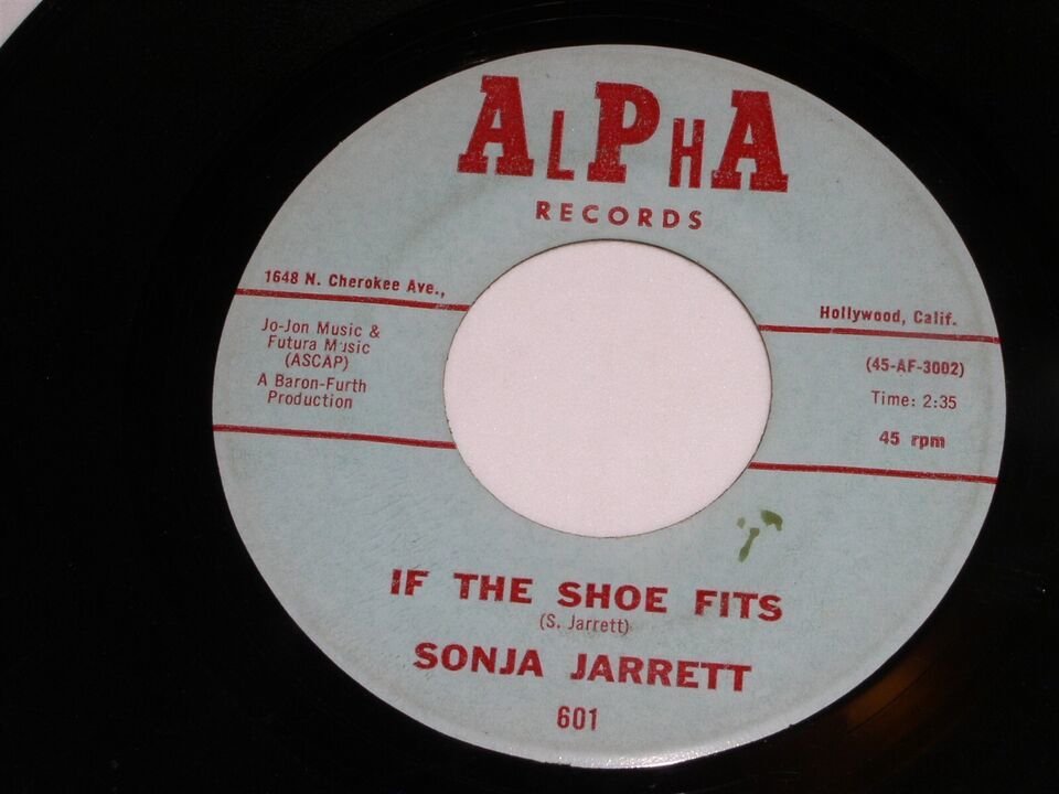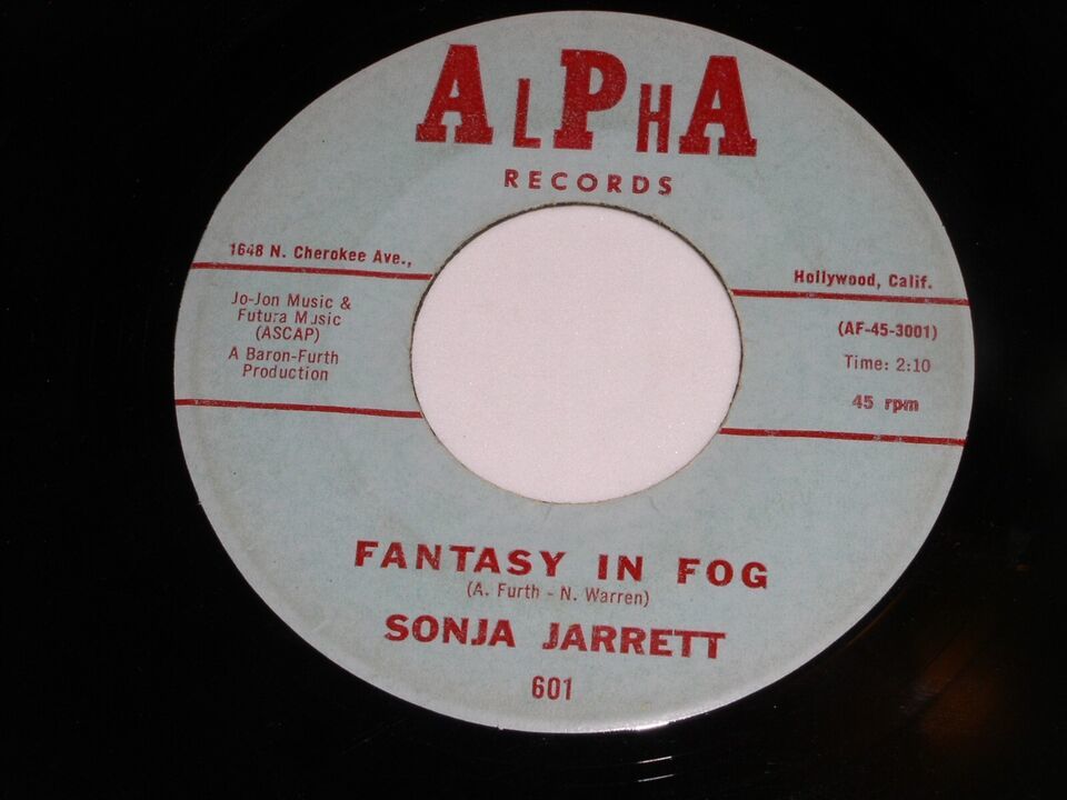 This is an original 45 rpm phonograph record by Sonja Jarrett, entitled "Fantasy In Fog". Flipside: "If The shoe Fits". Record label: Alpha 601.