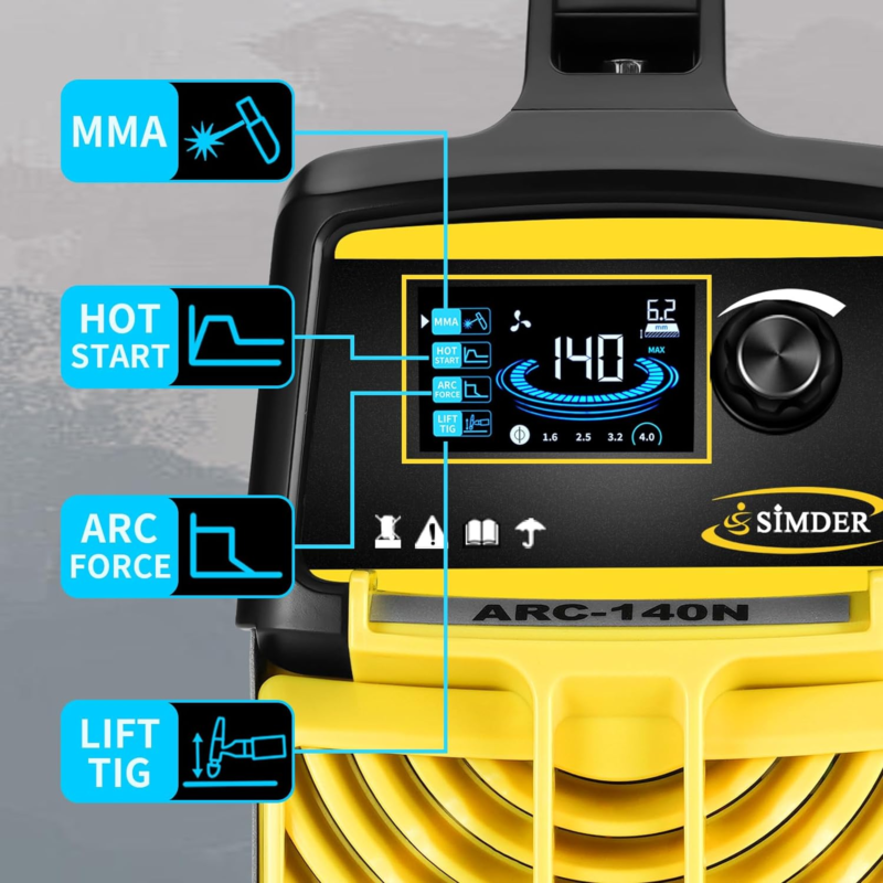 ?Smart LCD Digital Display?This ARC-140N Stick Welder has an Intelligent Digital Screen, Which Shows the Suggested Dimension of Welding Rods while Adjusting the Current. You can Switch to Different Mode(ARC Mode, Hot Start Function , Arc Force and TIG mode) and Make Adjustment accordingly.