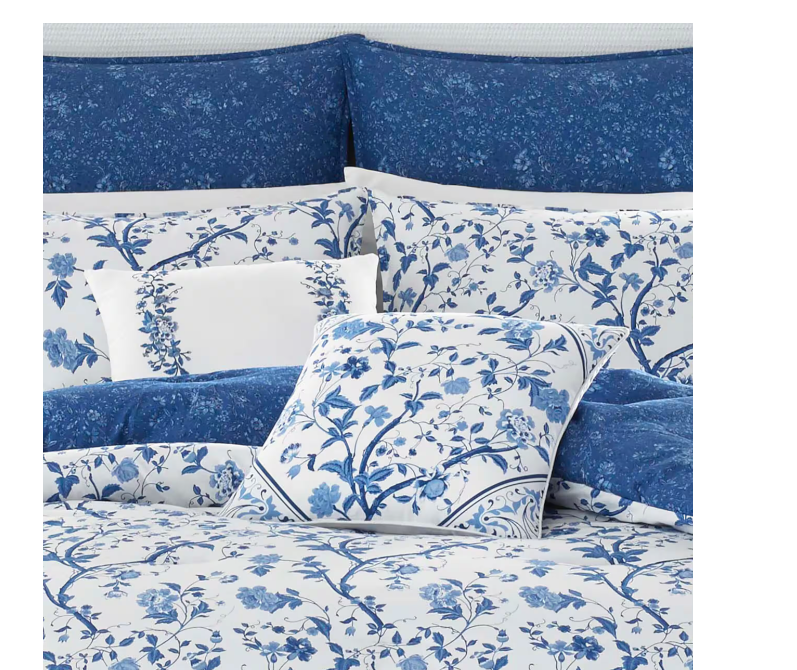 Blue and white porcelain has inspired beautiful floral textiles throughout history and its timeless appeal always looks fresh and in style. This striking floral vine pattern on a crisp white cotton ground is highlighted by a dramatic, deep blue floral mini print on the duvet cover reverse. This beautiful bedding set is 100 Percent cotton and machine washable for easy care. Duvet cover features button closure with inner ties. Duvet cover included in the set, the duvet insert is not included. Twin comforter set includes: 86 in. L x 63 in. W comforter and one 21 in. L x 27 in. W sham. Full/Queen comforter set includes: 92 in. L x 88 in. W comforter and two 21 in. L x 27 in. W shams. King comforter set includes: 92 in. L x 106 in. W comforter and two 21 in. L x 37 in. W shams. Polyester fill Included shams feature an easy overlap closure.