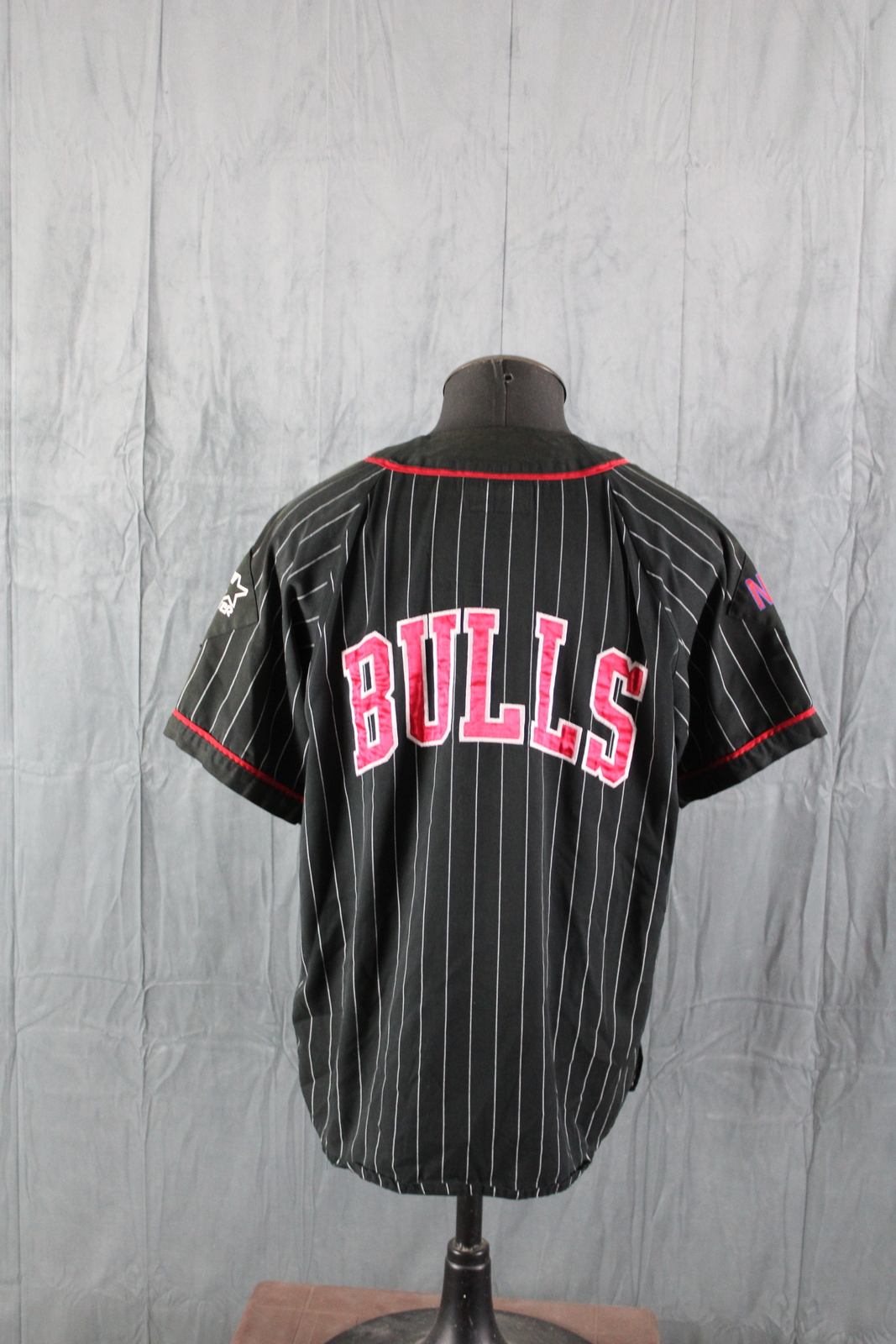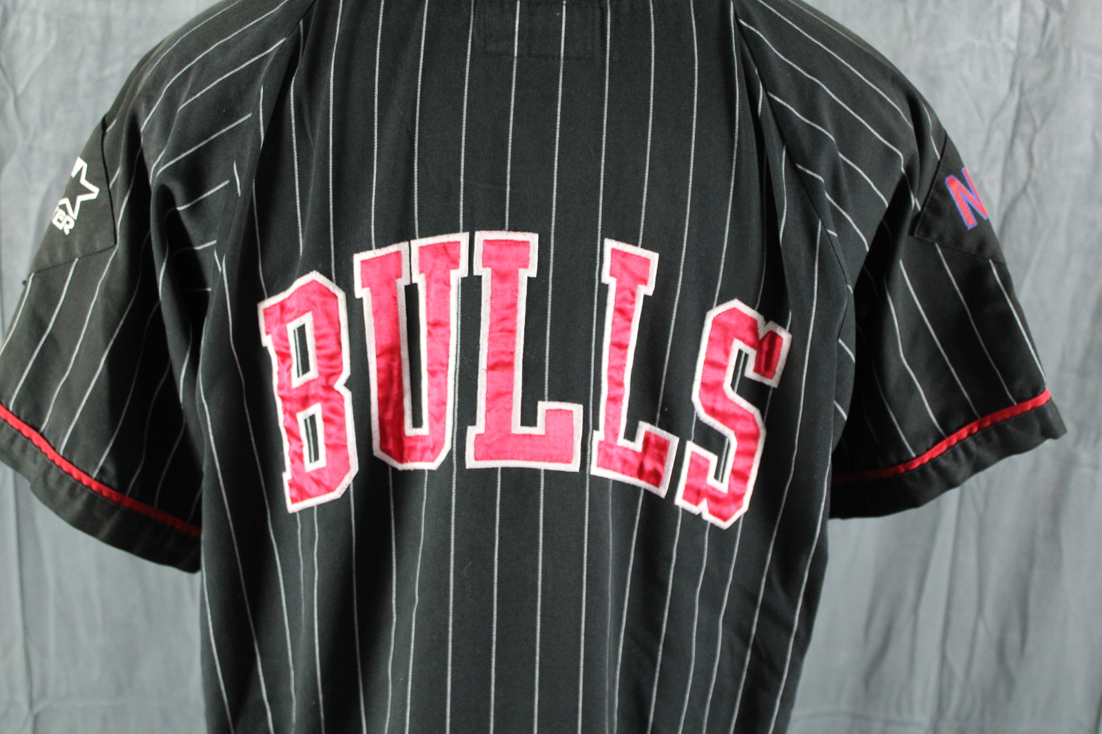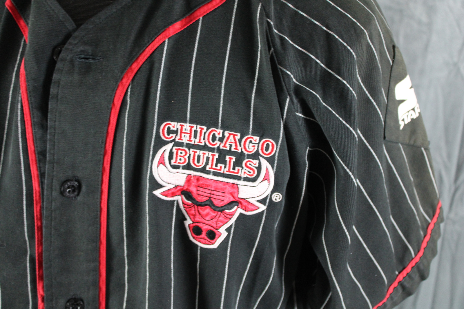 Up for sale is a vintage Chicago Bulls baseball jersey by Starter. It has a black base colour with white pinstripes. The front of the jersey has the Bulls logo crested on. One sleeve has the Starter logo crested on while the other sleeve has the NBA word logo crested on. The back of the jersey has Bulls crested on. What a great vintage jersey do not miss out on it.
