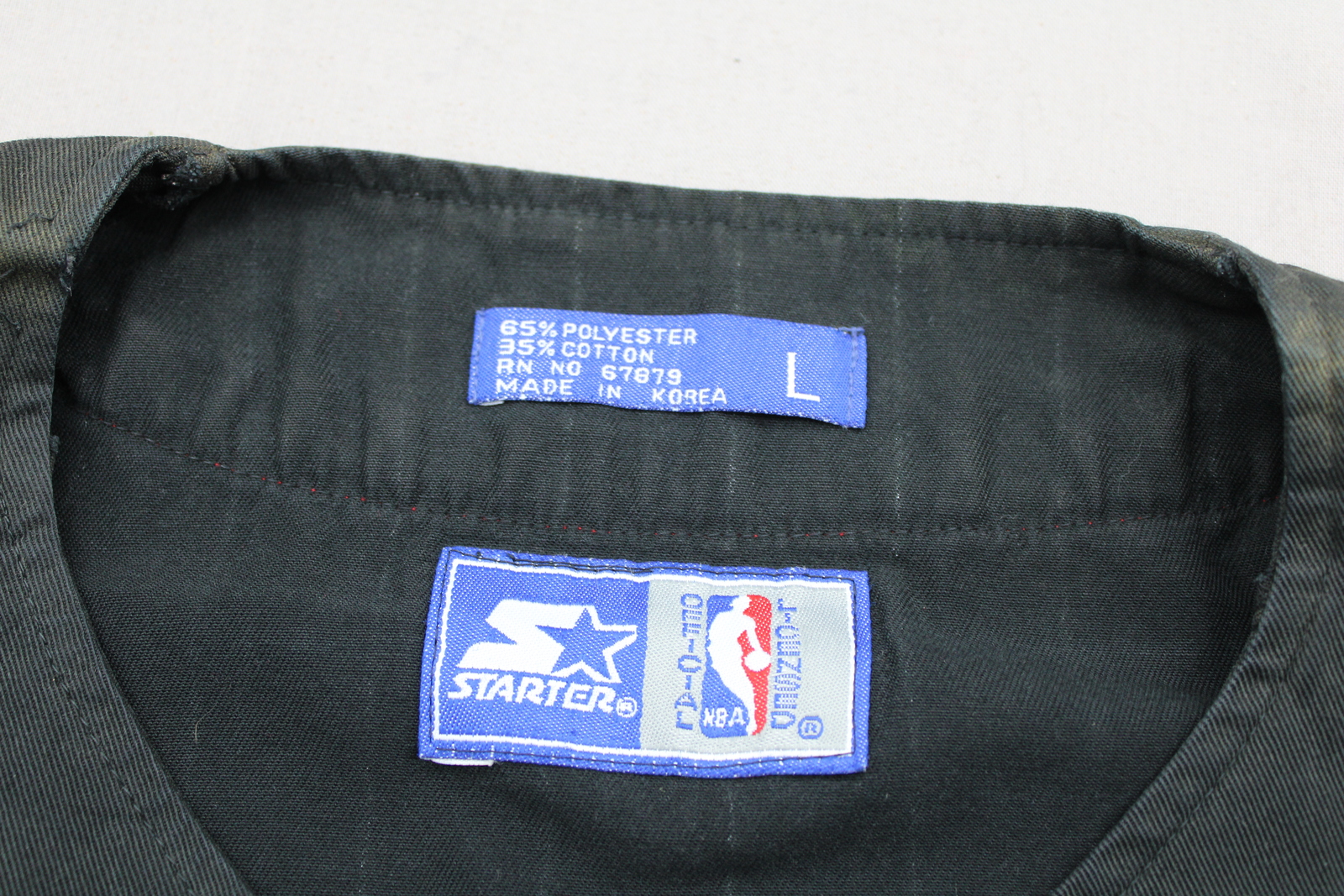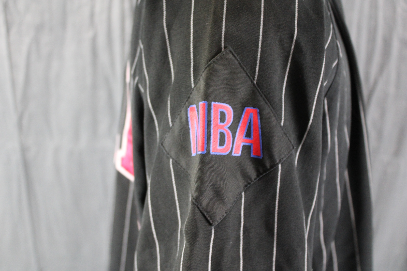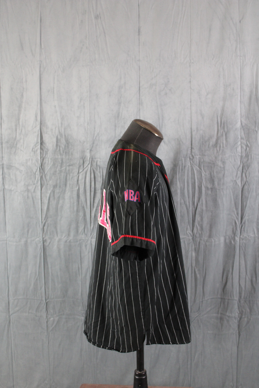 Up for sale is a vintage Chicago Bulls baseball jersey by Starter. It has a black base colour with white pinstripes. The front of the jersey has the Bulls logo crested on. One sleeve has the Starter logo crested on while the other sleeve has the NBA word logo crested on. The back of the jersey has Bulls crested on. What a great vintage jersey do not miss out on it.
