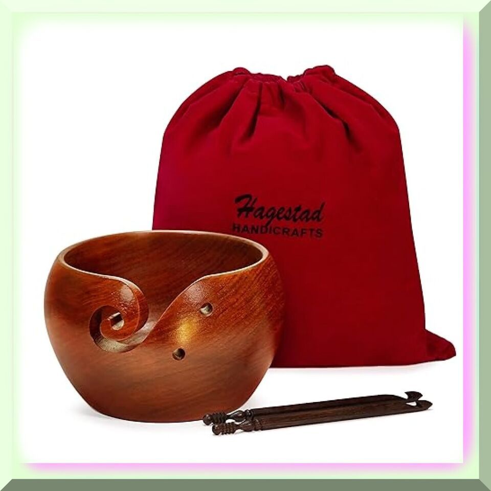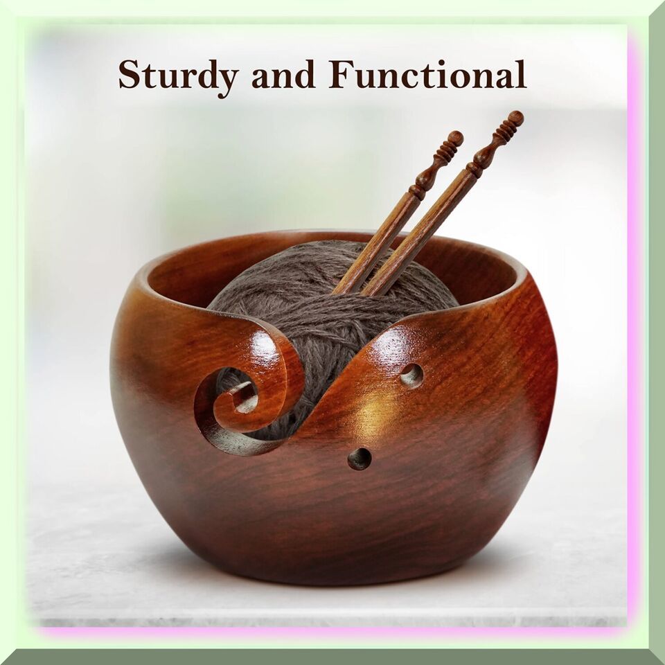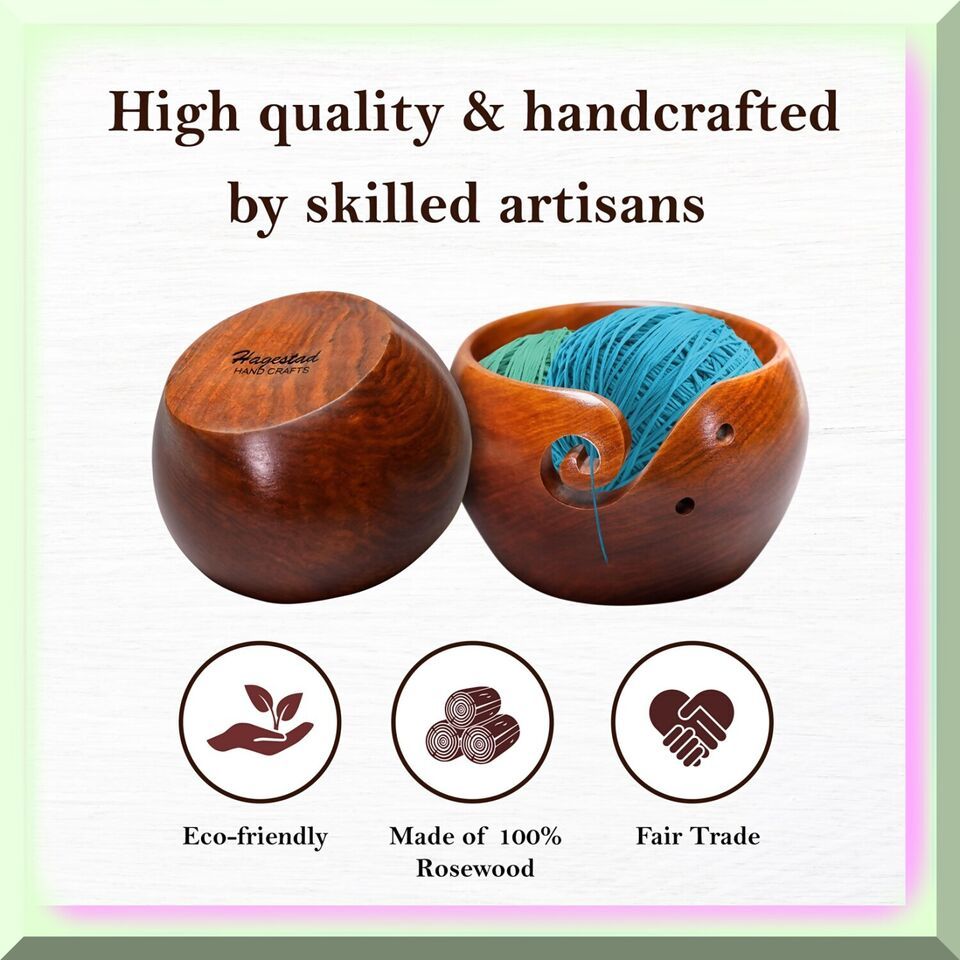 Discover the exquisite craftsmanship of our sustainable sheesham wood yarn bowl, handcrafted by skilled artisans in India. This sturdy yet lightweight bowl is designed to keep your yarn clean and in place while you work on your various knitting projects. The elegant swirls on the bowl provide extra support for your yarn, preventing it from tangling as you create. Plus, our yarn bowls come with two convenient holes to store your crochet hooks, each 6.5mm in diameter. And as a special bonus, you'll receive two FREE wooden crochet hooks in size J-10 with your purchase. Knitting just got a whole lot more stylish and organized! ==== FEATURES: ===== LIFETIME GUARANTEE: Our wooden yarn bowl comes with an ironclad promise - a lifetime guarantee. We take immense pride in the quality of our product and are willing to refund your purchase without any questions if you are unsatisfied. Your satisfaction is our top priority.