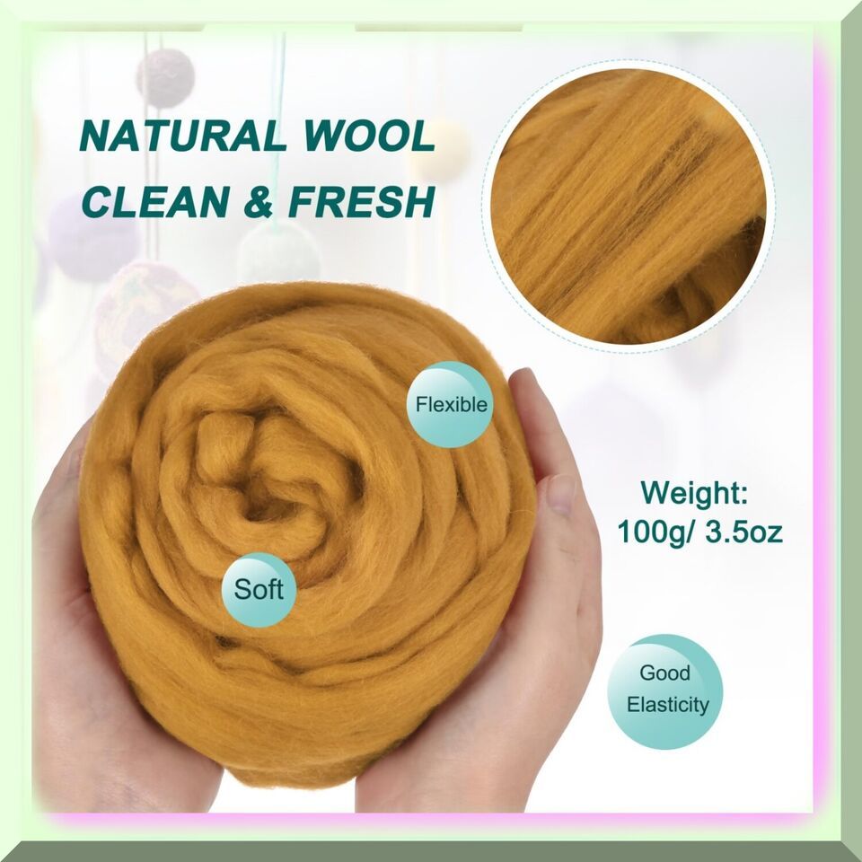 Experience the luxurious touch of our natural and soft wool material. Crafted with care, this needle felting wool is not only flexible and elastic but also perfect for shaping into any desired form. Tear off pieces effortlessly for wet felting and let your creativity run wild with a plethora of DIY projects. From needle felting to weaving, this versatile wool is ideal for beginners and a delightful way to bond with loved ones. Explore the endless possibilities by mixing vibrant colors and bring to life adorable dolls, plush animals, exquisite wool paintings, and more. Surprise your family and friends with unique handmade crafts on special occasions. This package includes 100g of brown yellow wool, ensuring hours of creative bliss. ===== FEATURES: ====== CONVENIENT INDIVIDUAL PACKAGING - Each roll of wool comes in a bag of 3.