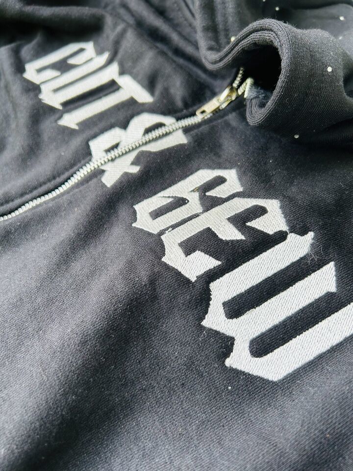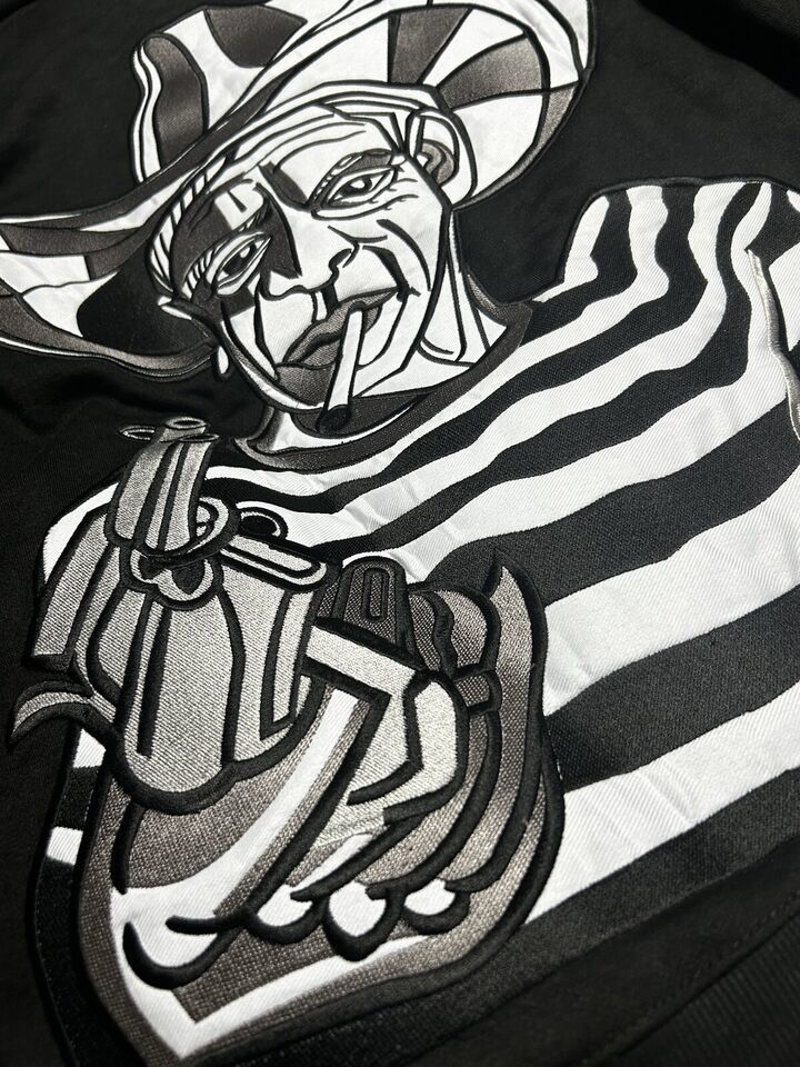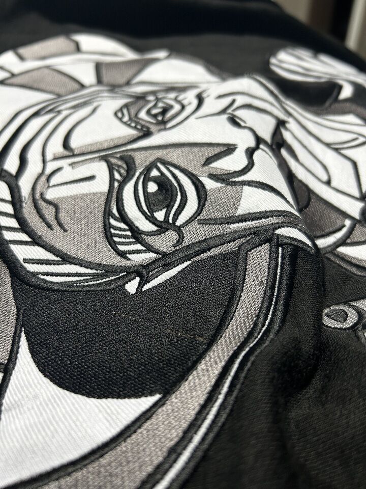 This hoodie is an absolute one of a kind, with an embroidered design covering most of the back of the hoodie , this is a heavy hoodie approximately 7-8lbs this hoodies should be dry cleaned only do not wash at all!